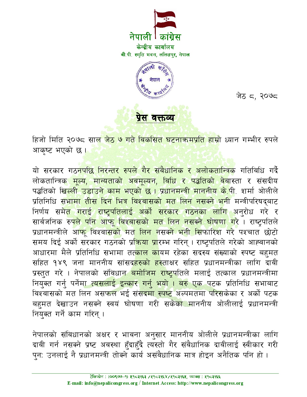 प्रधानमन्त्रीले हठात् अर्को सरकार गठनको सिफारिश गर्ने, राष्ट्रपतिले २४ घण्टाको पनि समय नदिई प्रधानमन्त्री नियुक्तिको आह्वान गर्ने, संविधान बमोजिम नियुक्त गर्नु पर्ने म प्रतिनिधि सभाका सदस्यलाई नियुक्त गर्नु पर्ने र दावी नै गर्न नमिल्ने माननीय ओलीलाई प्रधानमन्त्री नियुक्त गर्ने कार्य घोर असंवैधानिक, अलोकतान्त्रिक, अधिनायकवादी र सर्वसत्तावादी कार्य हुन् ।’