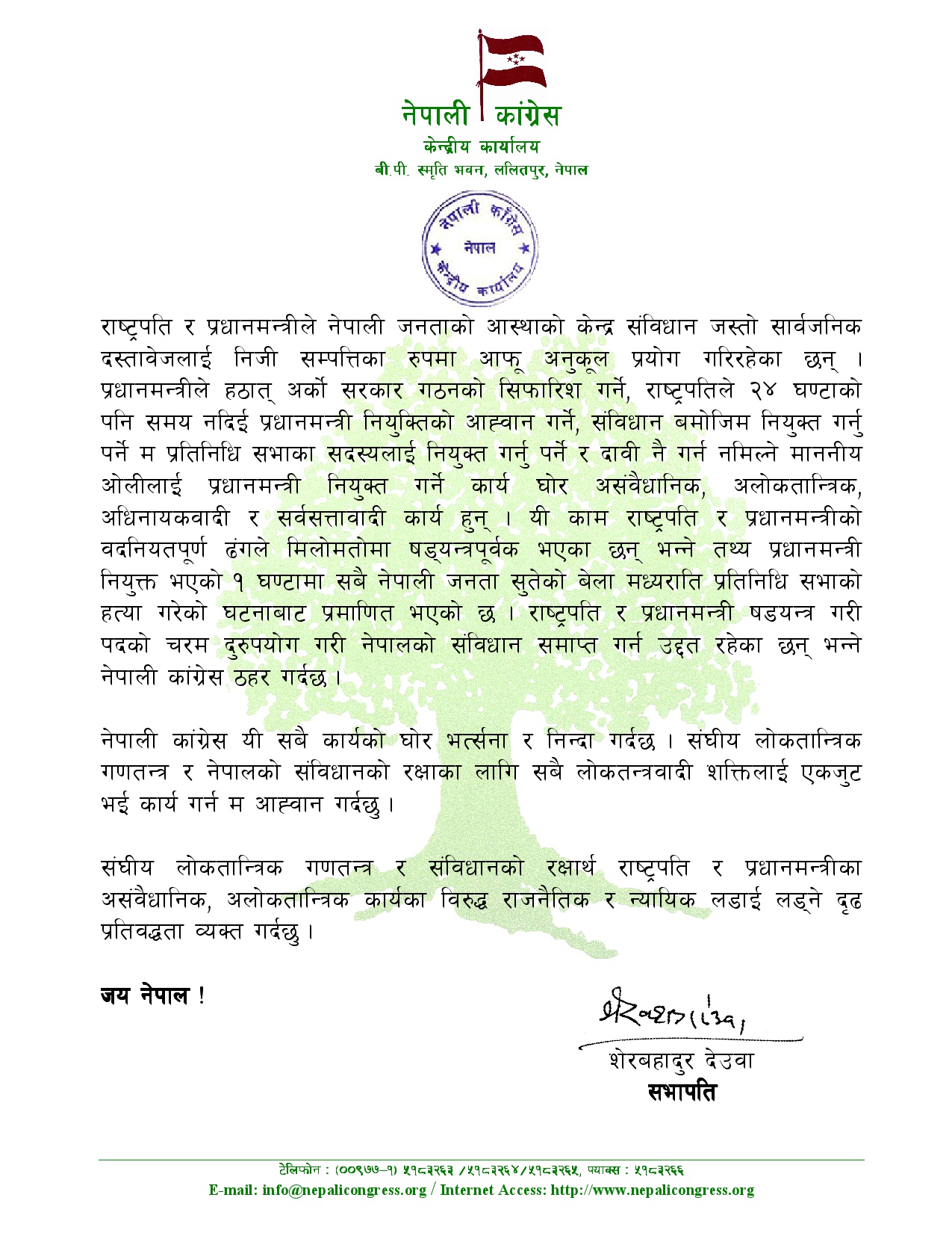 राष्ट्रपति र प्रधानमन्त्रीले वदनियतपूर्ण ढंगले मिलोमतोमा षड्यन्त्रपूर्वक मध्यराति प्रतिनिधि सभाको हत्या गरेको देउवाले उल्लेख गरेका छन् । साथै उनले संविधानको रक्षकालागि लोकतन्त्रवादी शक्तिलाई एकजुट हुन आह्वान गरेका छन् ।