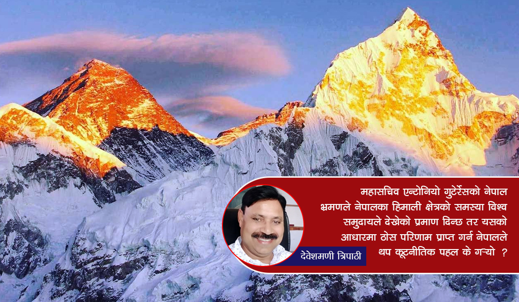 हुन त महासचिव एन्टोनियो गुटेर्रेसको नेपाल भ्रमणले नेपालका हिमाली क्षेत्रको समस्या विश्व समुदायले देखेको प्रमाण दिन्छ तर यसको आधारमा ठोस परिणाम प्राप्त गर्न नेपालले थप कूटनीतिक पहल के गर्यो ? महासचिवको भ्रमण र कोप सम्मेलनमा नेपालको अवस्थाको प्रस्तुति सकारात्मक भए पनि यसले अन्तर्राष्ट्रिय सहयोग जुटाउनमा प्रत्यक्ष प्रभाव पार्यो वा पार्न सकेन भन्ने विषय स्पष्ट हुनुपर्छ ।