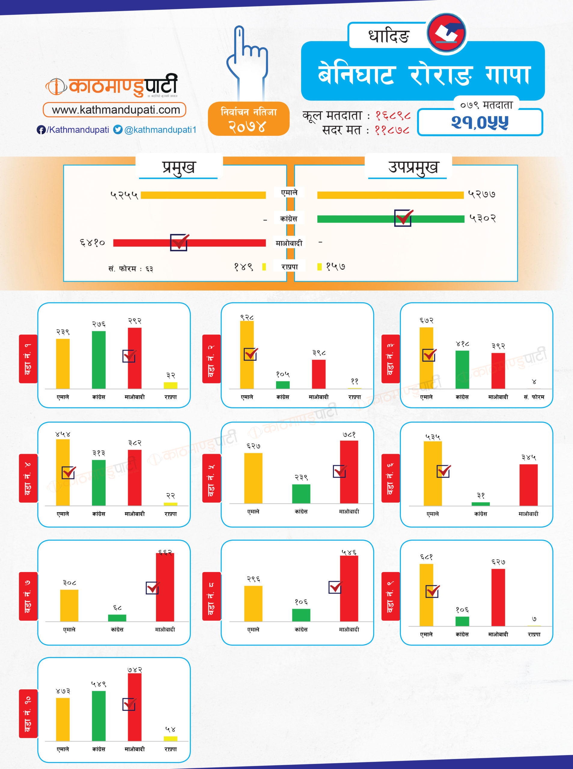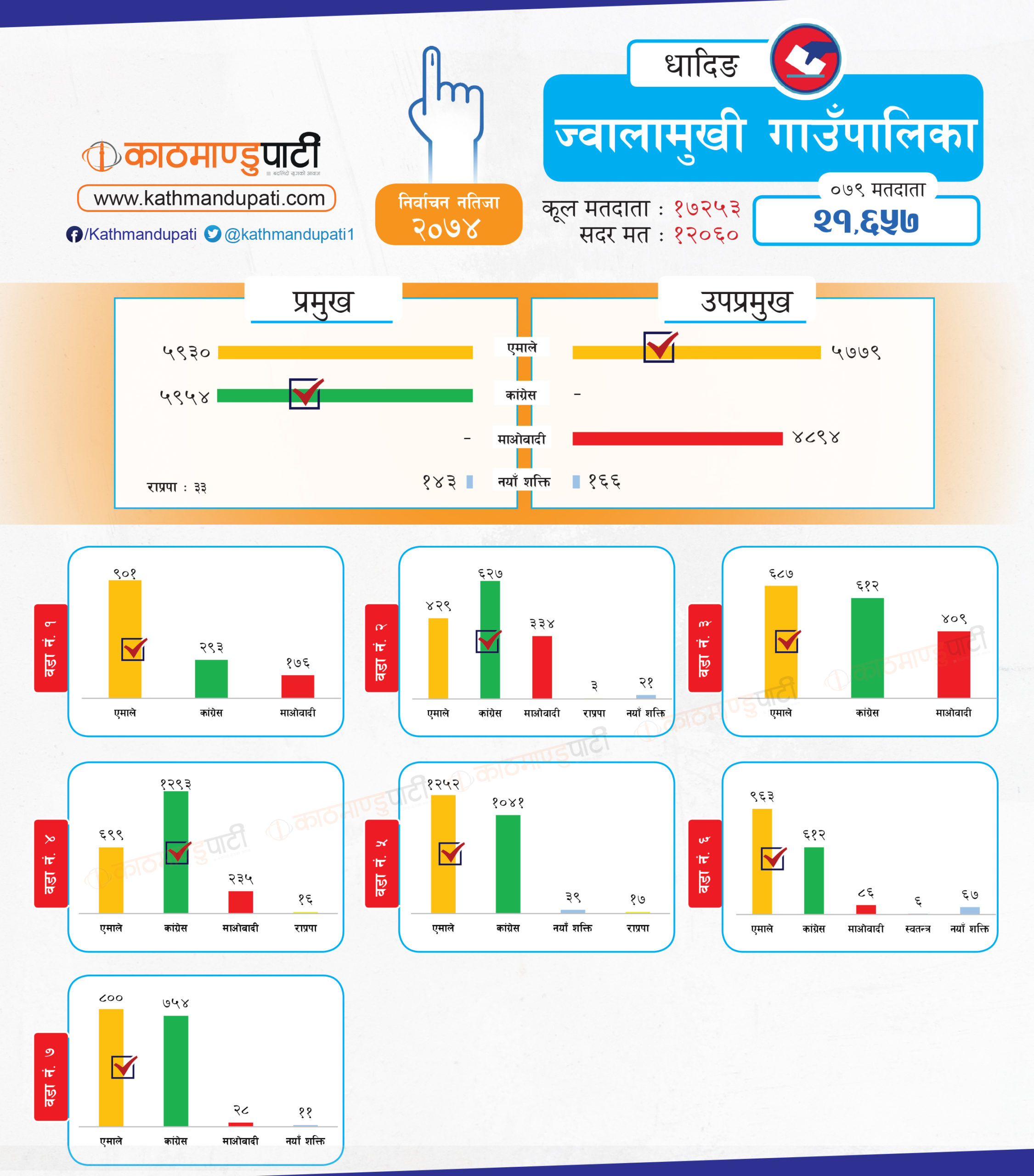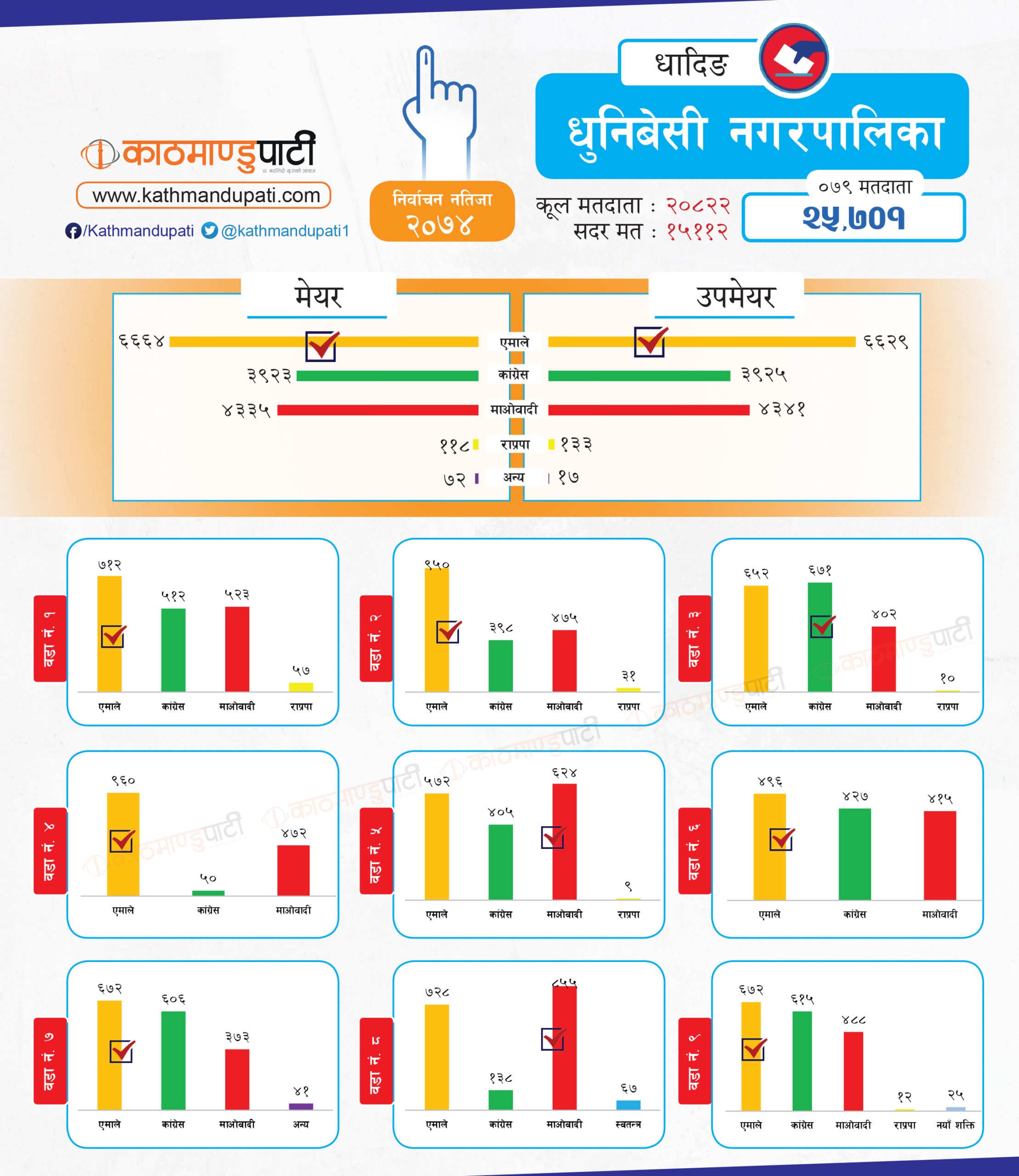उसले धुनीबेसी नगरपालिकाको मेयर–उपमेयर तथा गजुरी, गल्छी, थाक्रे, त्रिपुरासुन्दरी, गंगाजमुना र सिद्धलेक गाउँपालिकामा अध्यक्ष–उपाध्यक्ष नै जित्यो । यस्तै, नेत्रावतीको अध्यक्ष र ज्वालामुखीको उपाध्यक्ष पनि एमालेले जितेको थियो । कांग्रेसले नीलकण्ठ नगरपालिकाको मेयर र ज्वालामुखी गाउँपालिकाको अध्यक्ष तथा बेनीघाट–रोराङको उपाध्यक्ष मात्रै जित्यो । माओवादीले बेनीघाट–रोराङ गाउँपालिकाको अध्यक्ष तथा नीलकण्ठको उपमेयर र नेत्रावतीको उपाध्यक्ष जित्यो ।