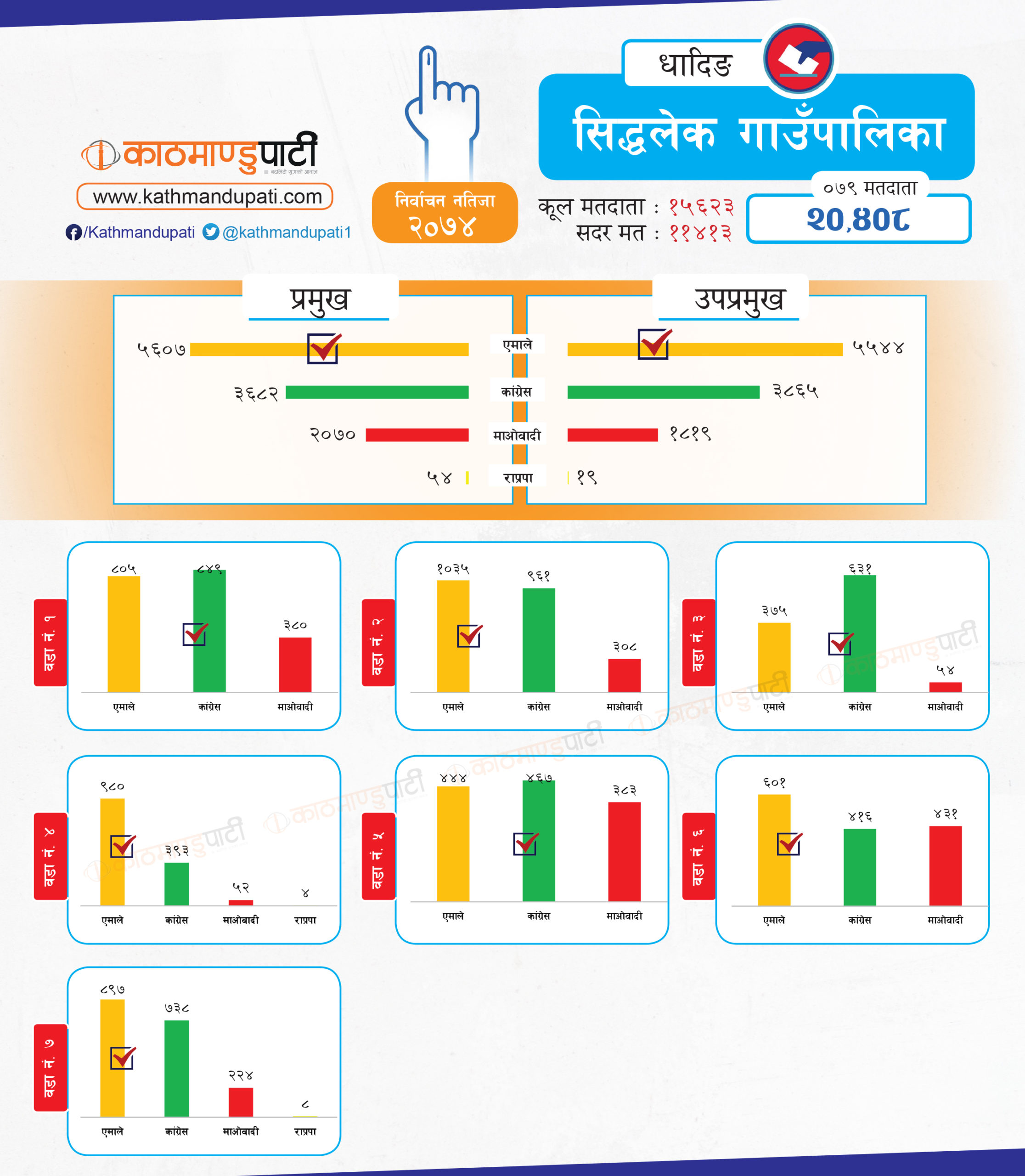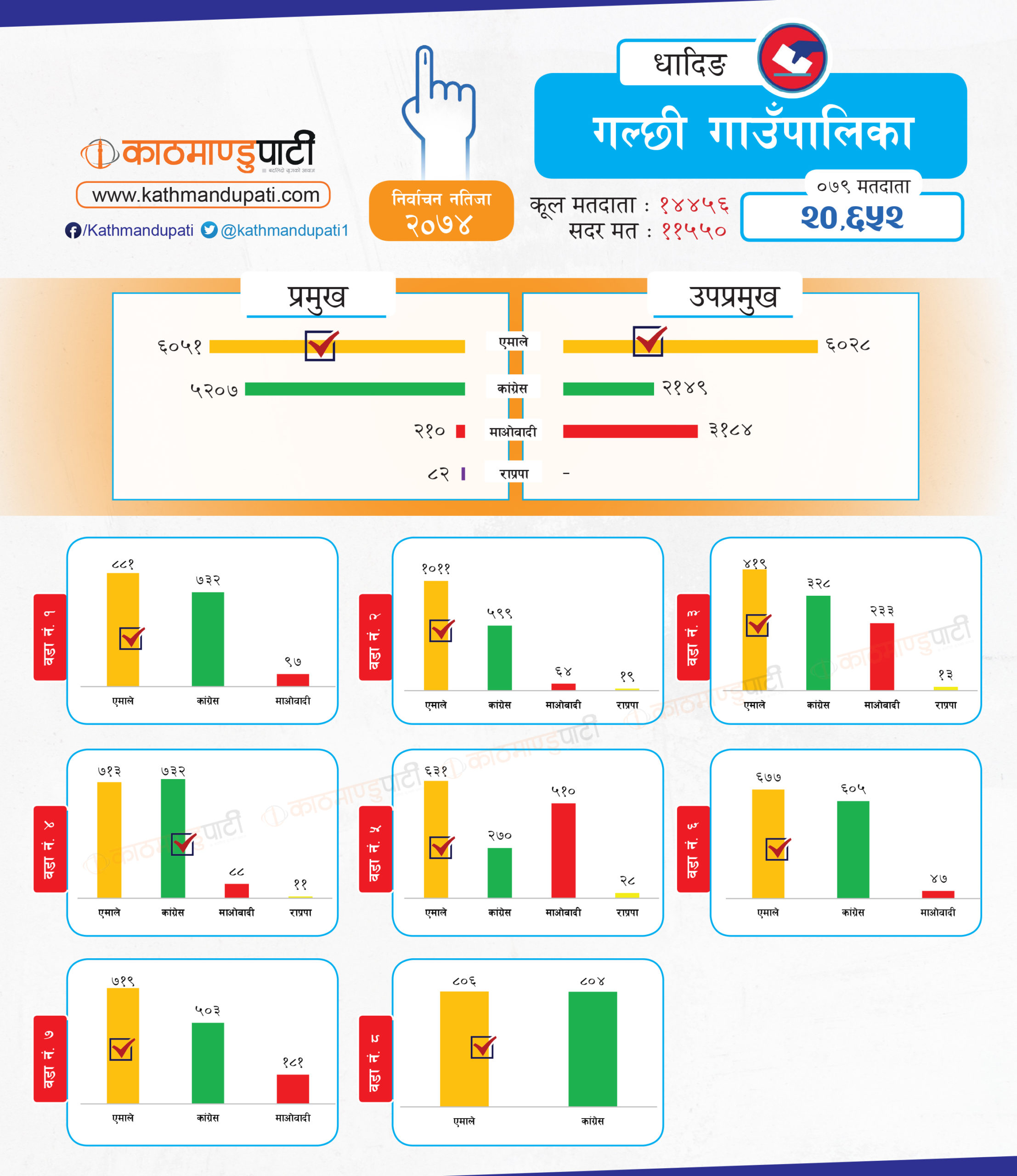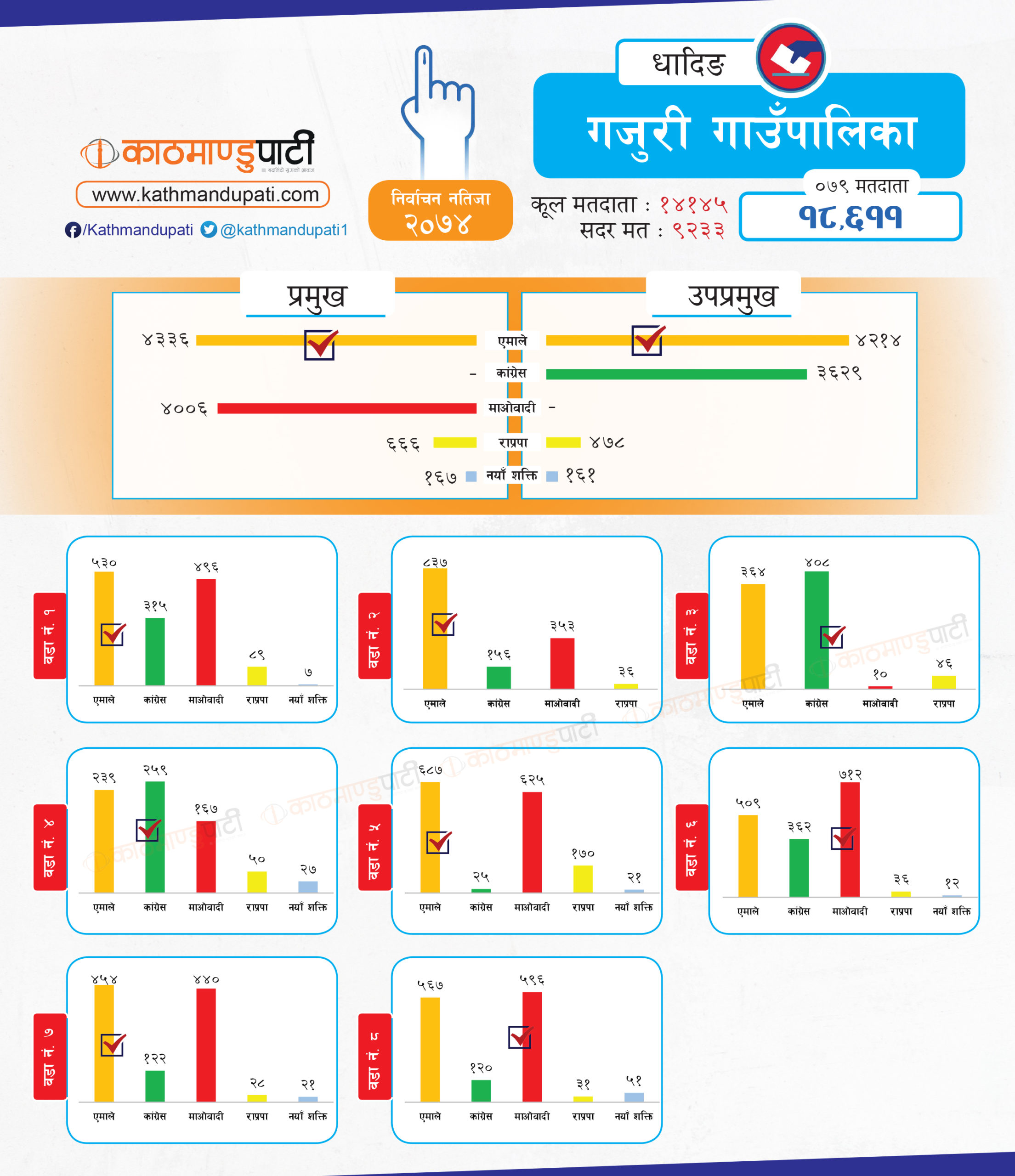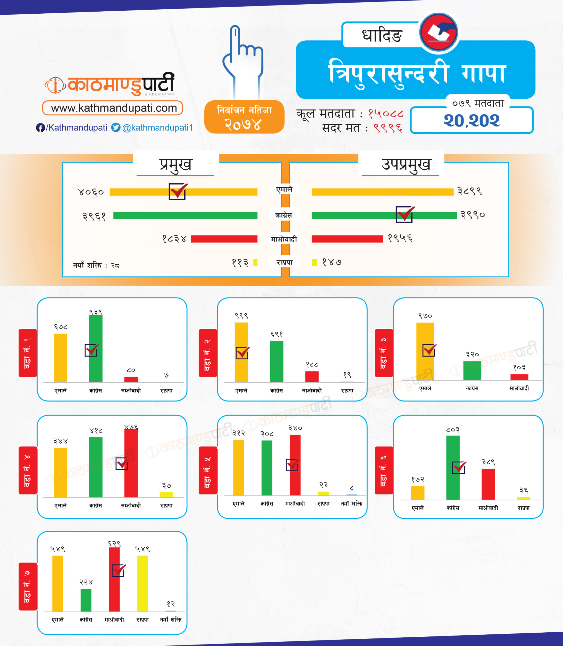 उसले धुनीबेसी नगरपालिकाको मेयर–उपमेयर तथा गजुरी, गल्छी, थाक्रे, त्रिपुरासुन्दरी, गंगाजमुना र सिद्धलेक गाउँपालिकामा अध्यक्ष–उपाध्यक्ष नै जित्यो । यस्तै, नेत्रावतीको अध्यक्ष र ज्वालामुखीको उपाध्यक्ष पनि एमालेले जितेको थियो । कांग्रेसले नीलकण्ठ नगरपालिकाको मेयर र ज्वालामुखी गाउँपालिकाको अध्यक्ष तथा बेनीघाट–रोराङको उपाध्यक्ष मात्रै जित्यो । माओवादीले बेनीघाट–रोराङ गाउँपालिकाको अध्यक्ष तथा नीलकण्ठको उपमेयर र नेत्रावतीको उपाध्यक्ष जित्यो ।