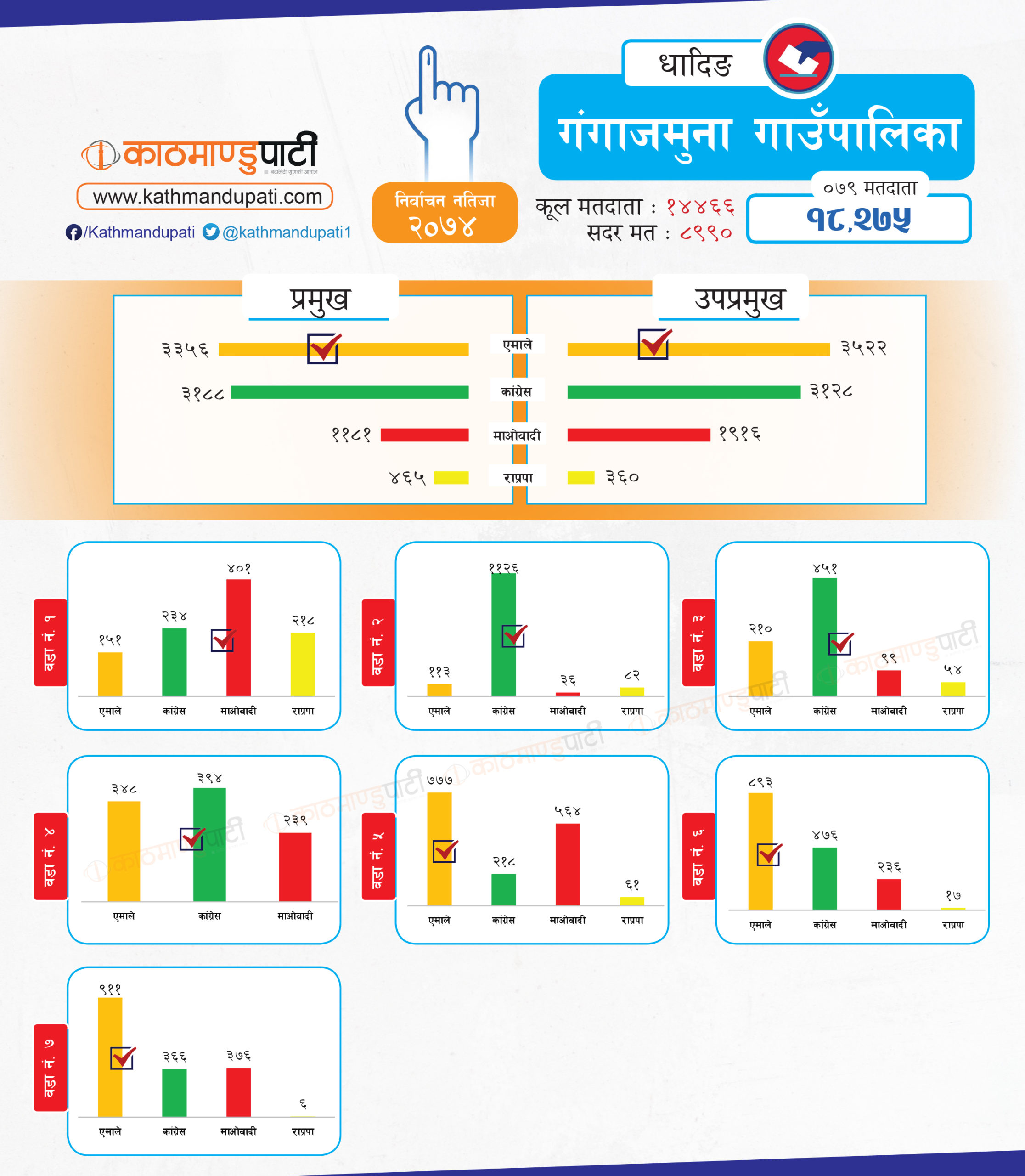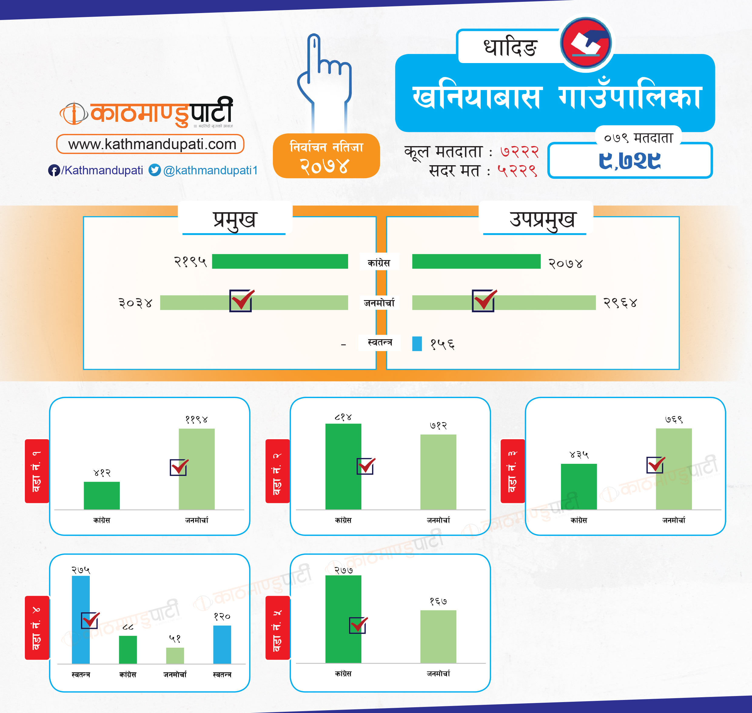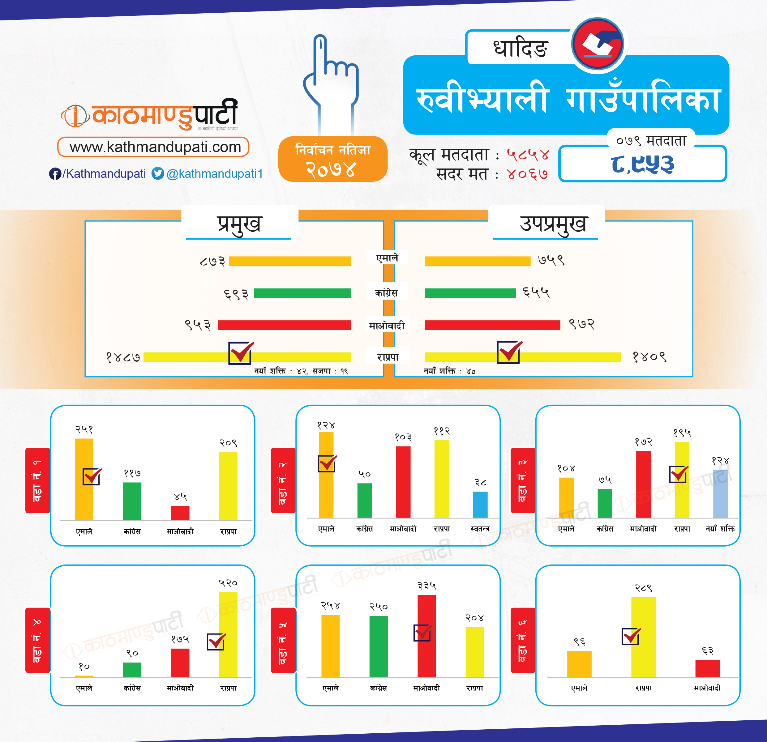 राष्ट्रिय जनमोर्चाले खनियावास गाउँपालिकाको अध्यक्ष–उपाध्यक्षमा जित निकाल्यो । एकीकृत समाजवादीका नेता एवं बागमती प्रदेशका मुख्यमन्त्री राजेन्द्र पाण्डेको जिल्ला भएकाले पनि धादिङमा एमाले विभाजनको असर बढी परेको छ । त्यसैले यसपटकको चुनाव एमालेका लागि सहज देखिँदैन । त्यसमा पनि सत्ता गठबन्धनकारी दल मिलेर मैदानमा आएका छन् ।