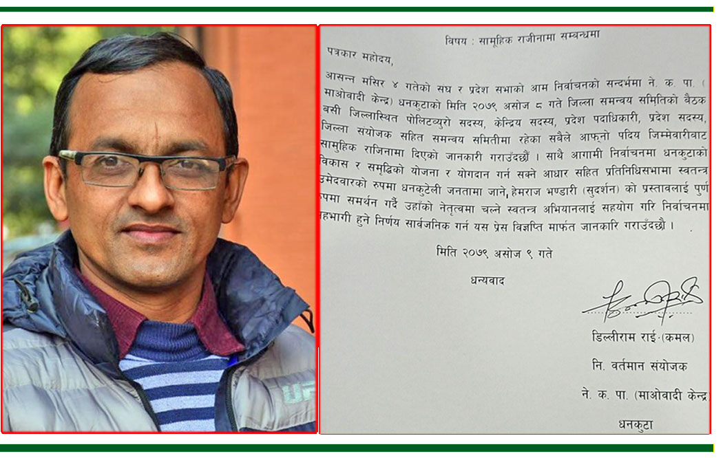 काठमाण्डु- नेकपा माओवादी केन्द्र धनकुटाका नेता–कार्यकर्ताले सामूहिक राजीनामा दिएका छन् । आइतबार माओवादी धनकुटाका नेता कार्यकर्ताले सामूहिक राजीनामा दिंदै मंसिर ४ गते हुने संघ र प्रदेशसभाको निर्वाचन अन्तर्गत स्वतन्त्र उमेदवारी दिने घोषणा गरेका हुन् ।