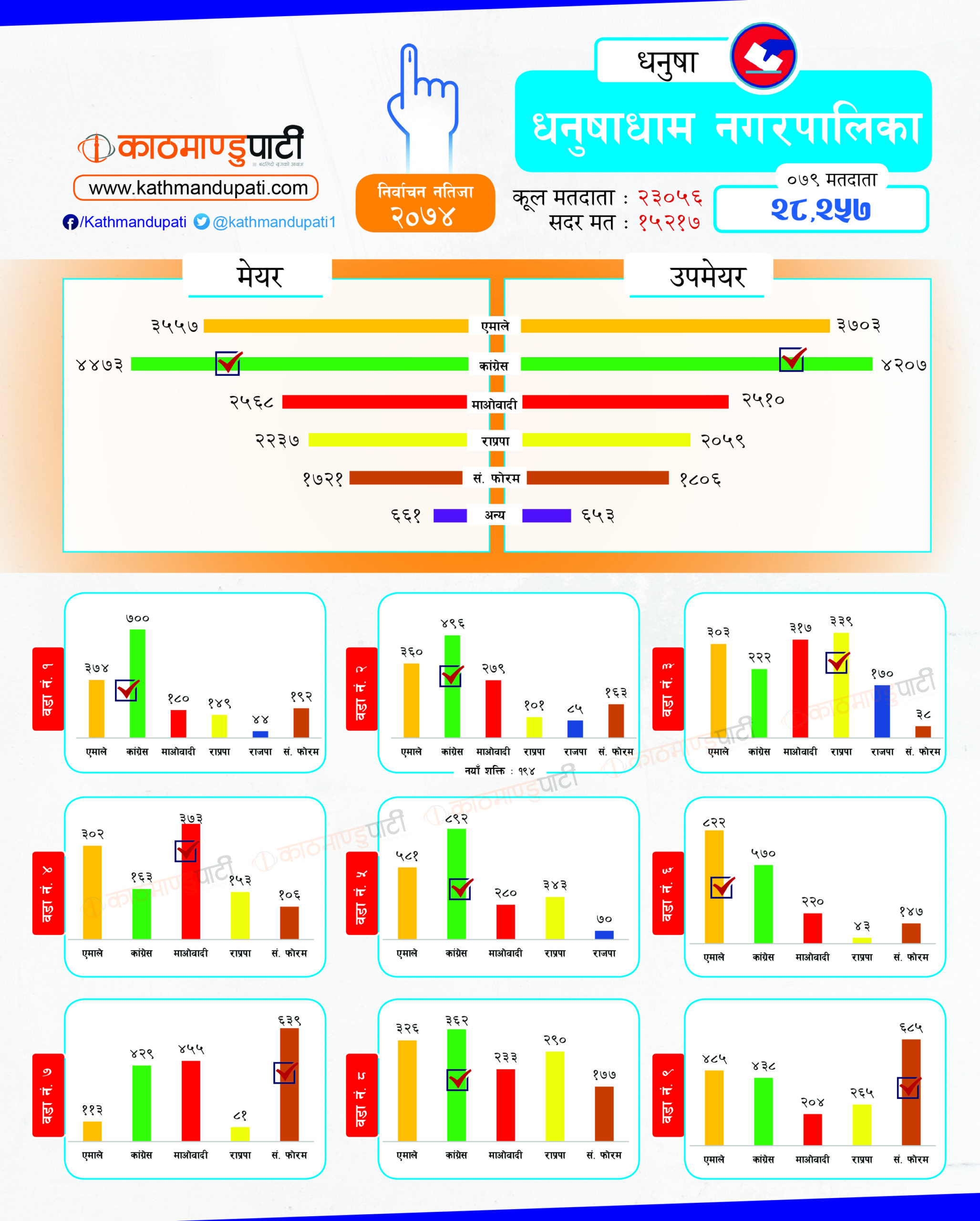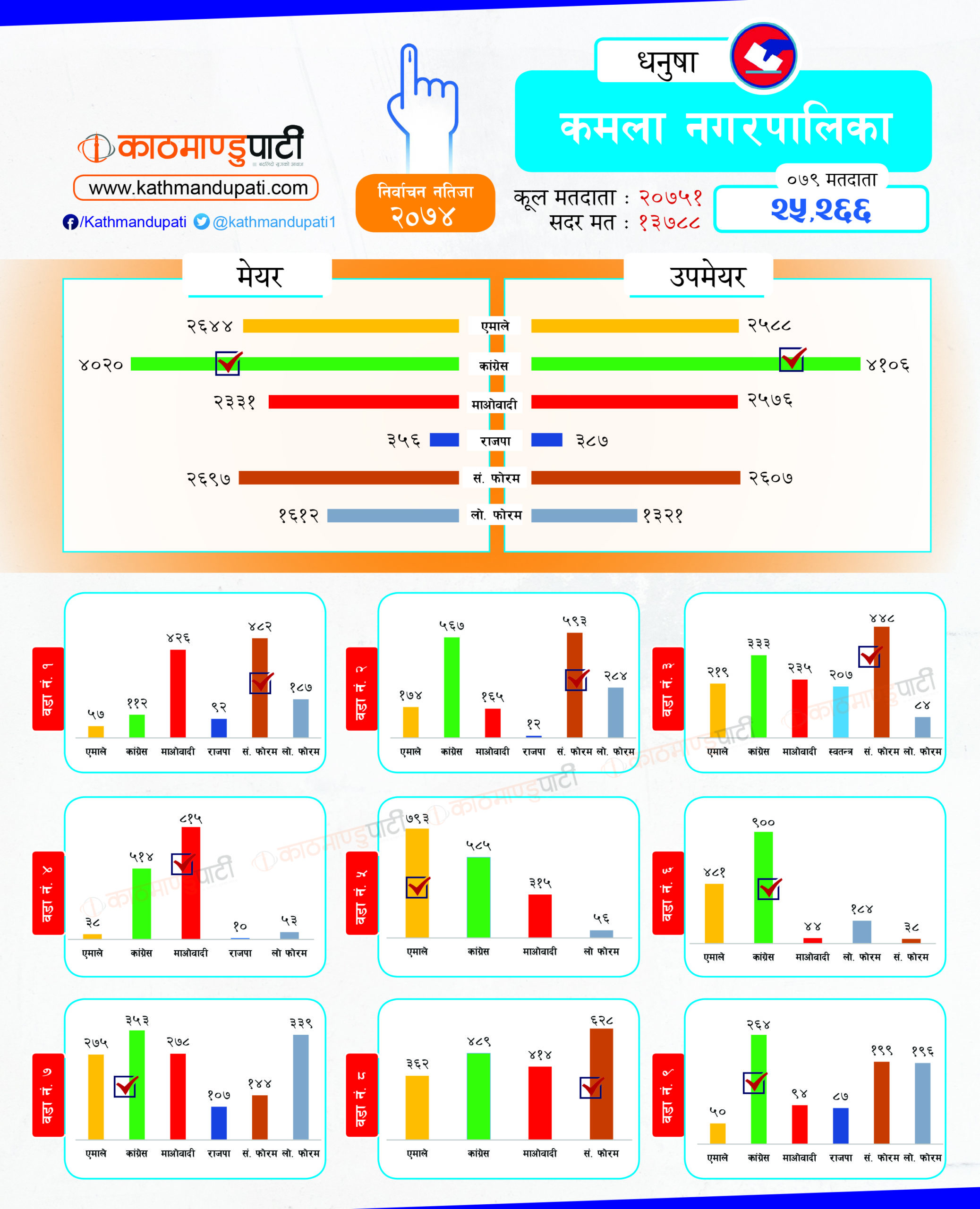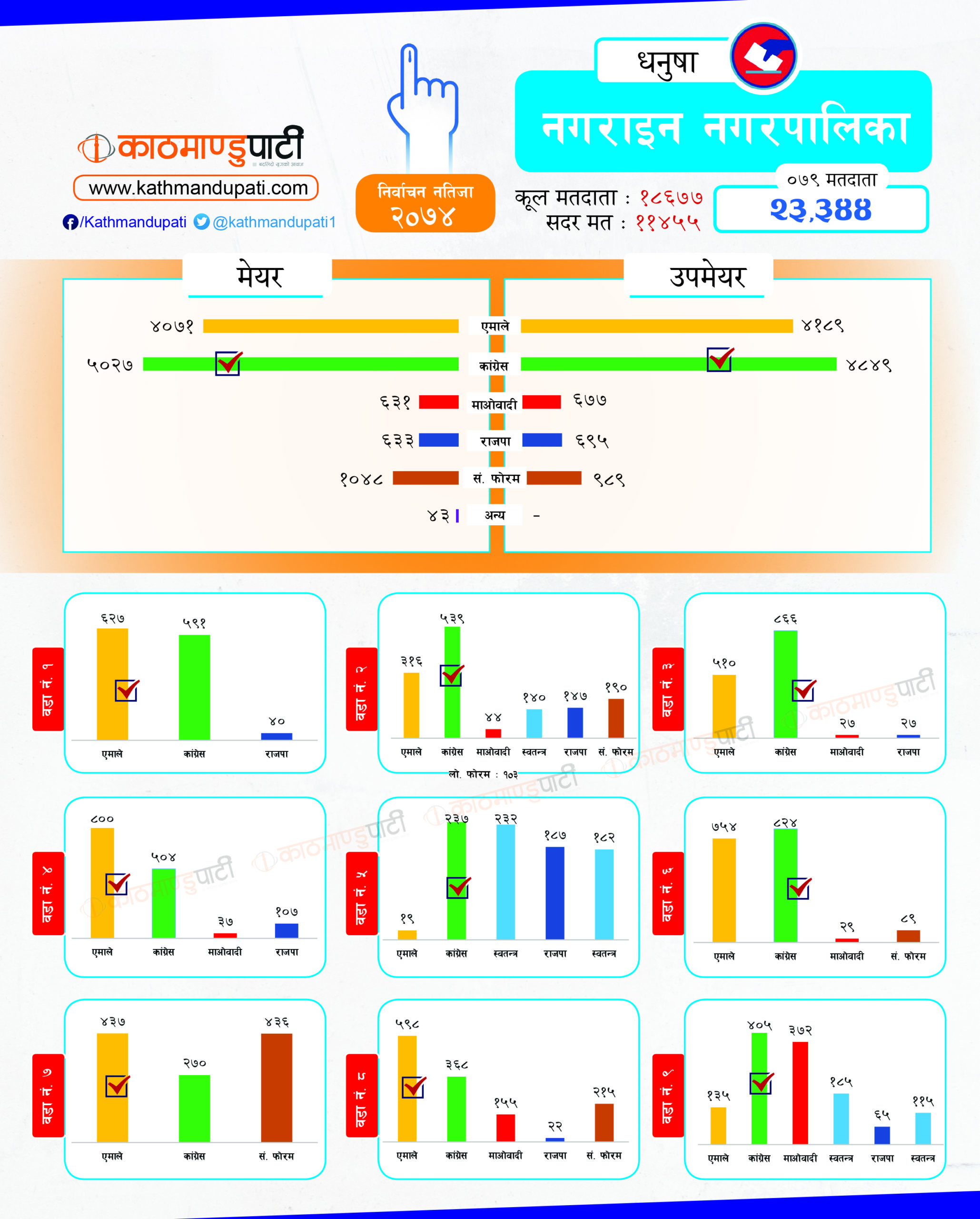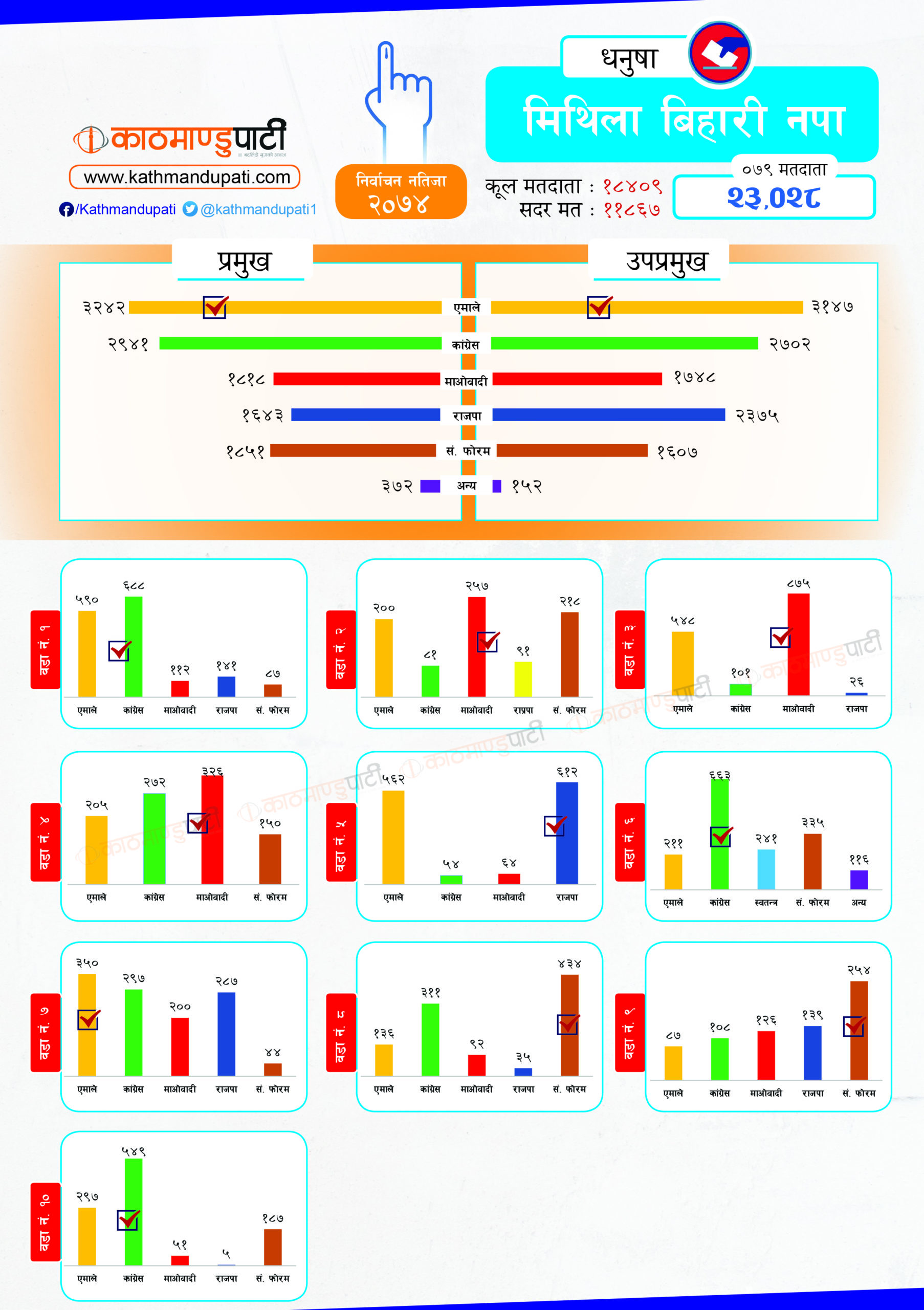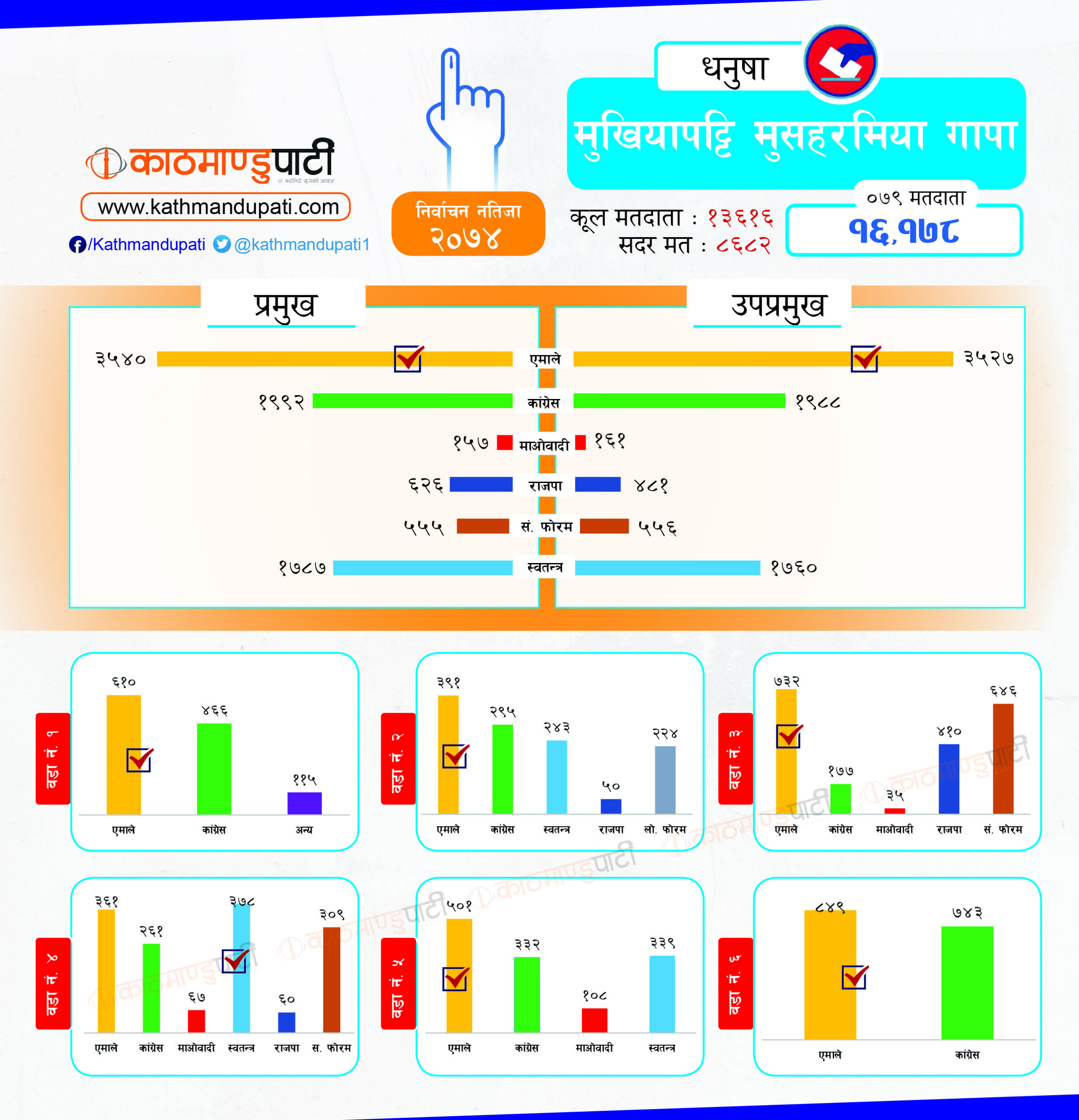 कांग्रेसले कमला, क्षिरेश्वर, धनुषाधाम र नगराइन नगरपालिकामा मेयर–उपमेयर, सबैलामा मेयर तथा औरही, जनकनन्दिनी र धनौजी गाउँपालिकामा अध्यक्ष–उपाध्यक्ष जितेको थियो । एमालेले मिथिला–बिहारी र मिथिला नगरपालिकाको मेयर–उपमेयर तथा बटेश्वर र मुखियापट्टी–मुसहरमिया गाउँपालिकामा अध्यक्ष–उपाध्यक्ष जित्यो ।