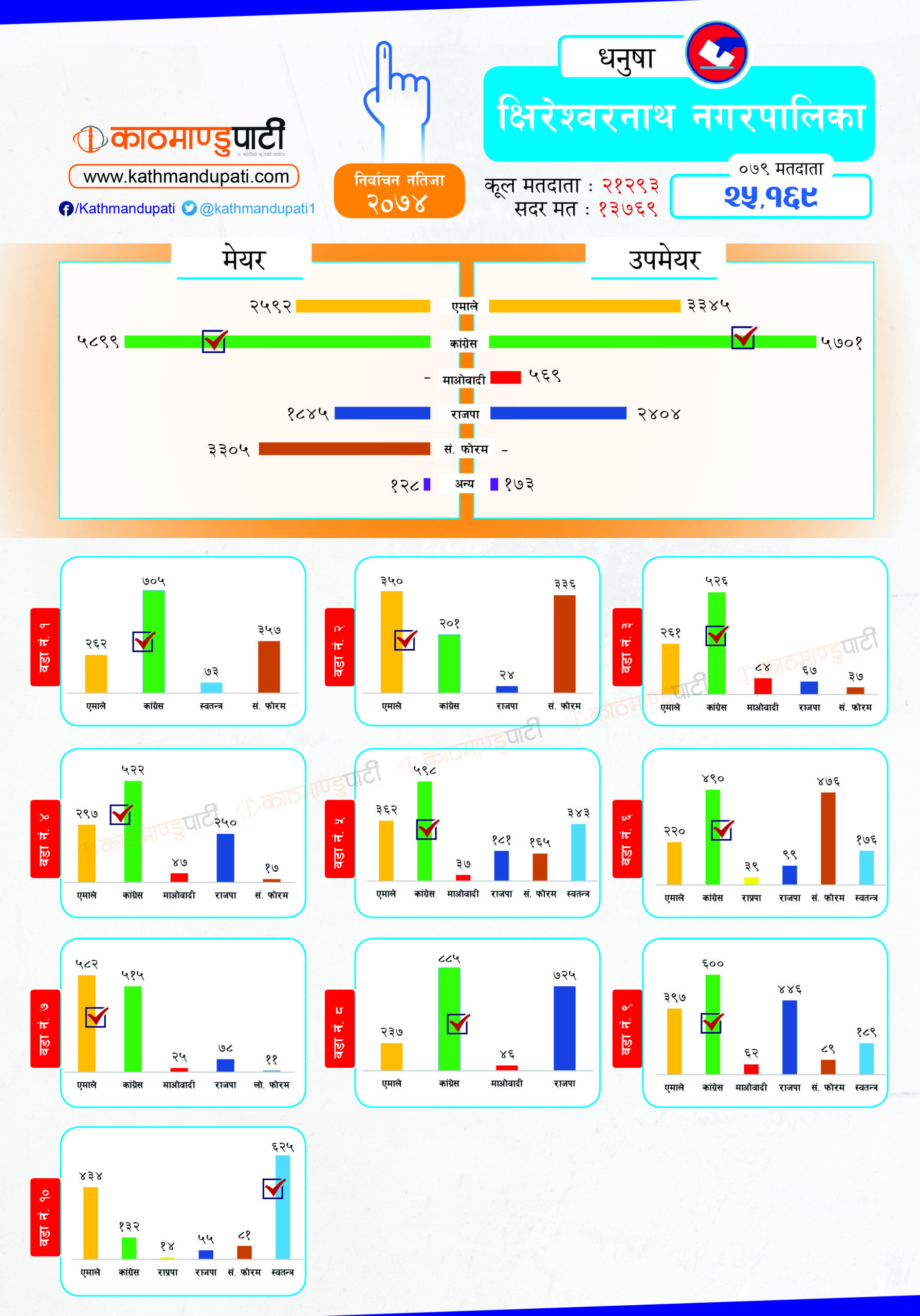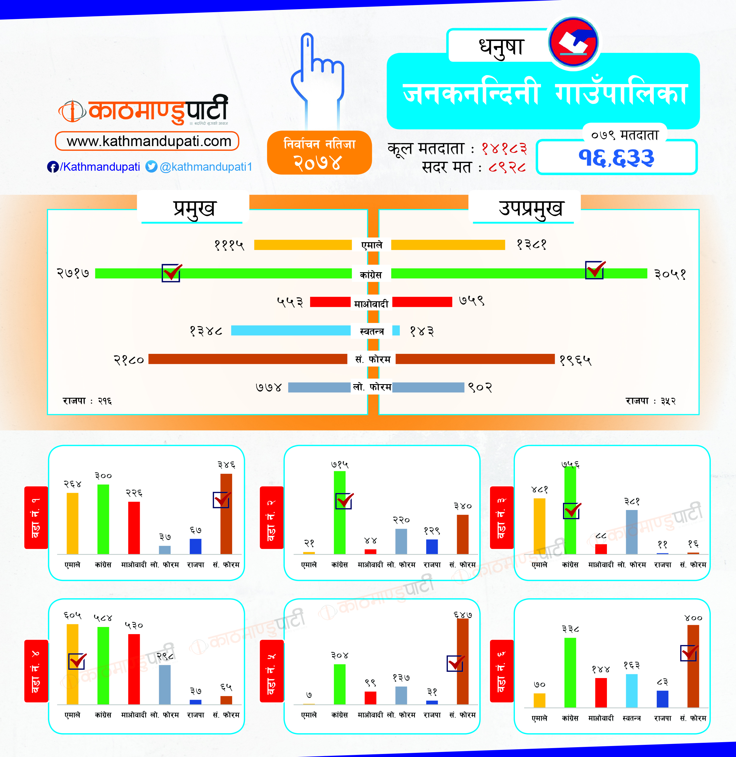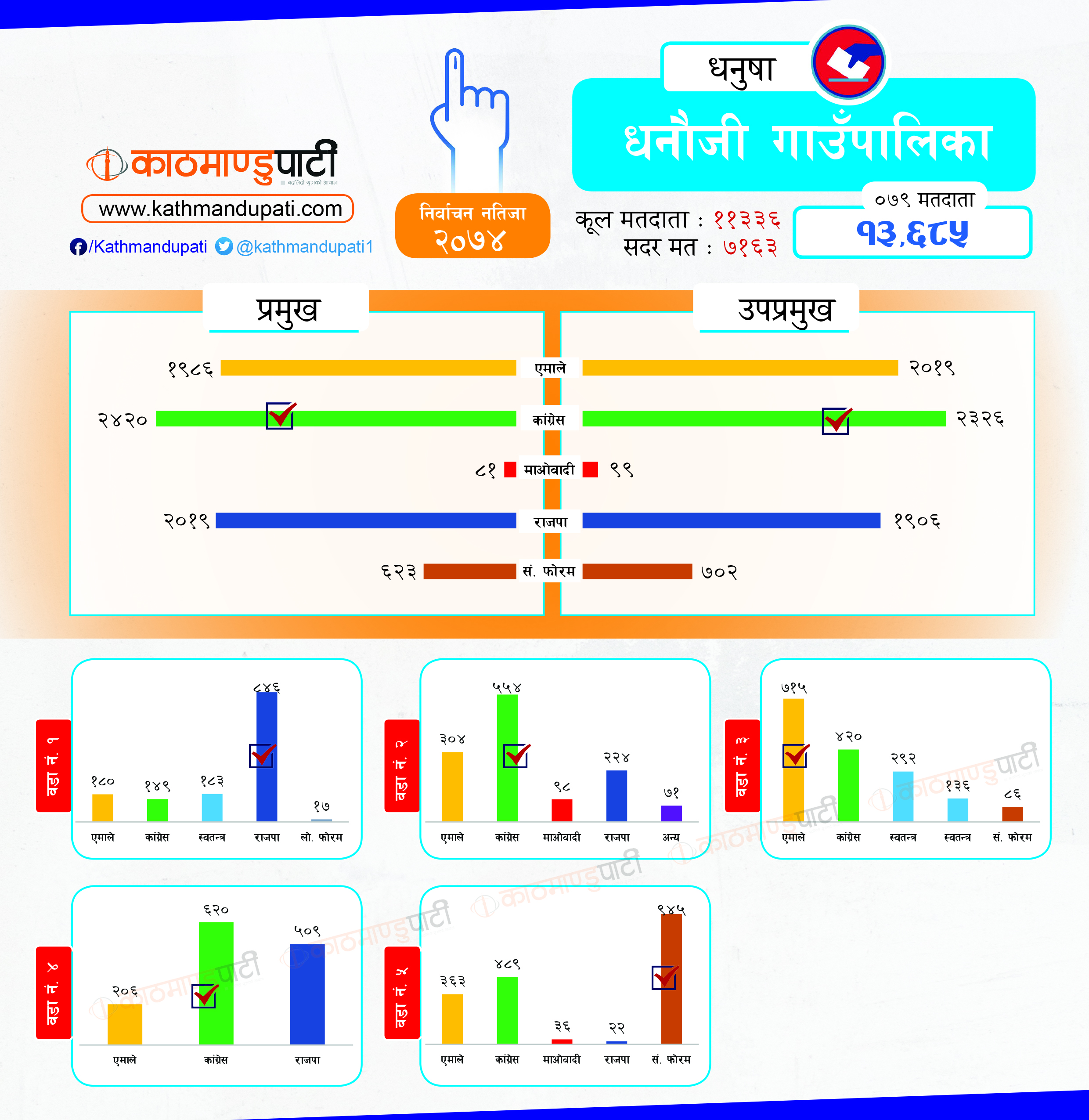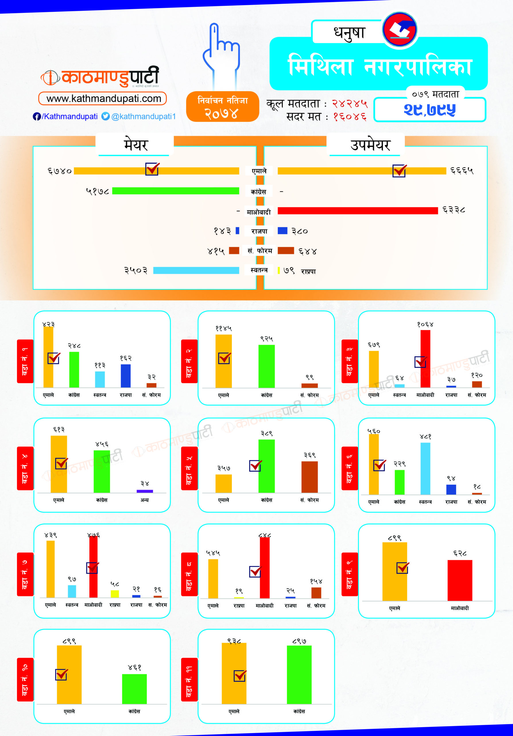 कांग्रेसले कमला, क्षिरेश्वर, धनुषाधाम र नगराइन नगरपालिकामा मेयर–उपमेयर, सबैलामा मेयर तथा औरही, जनकनन्दिनी र धनौजी गाउँपालिकामा अध्यक्ष–उपाध्यक्ष जितेको थियो । एमालेले मिथिला–बिहारी र मिथिला नगरपालिकाको मेयर–उपमेयर तथा बटेश्वर र मुखियापट्टी–मुसहरमिया गाउँपालिकामा अध्यक्ष–उपाध्यक्ष जित्यो ।