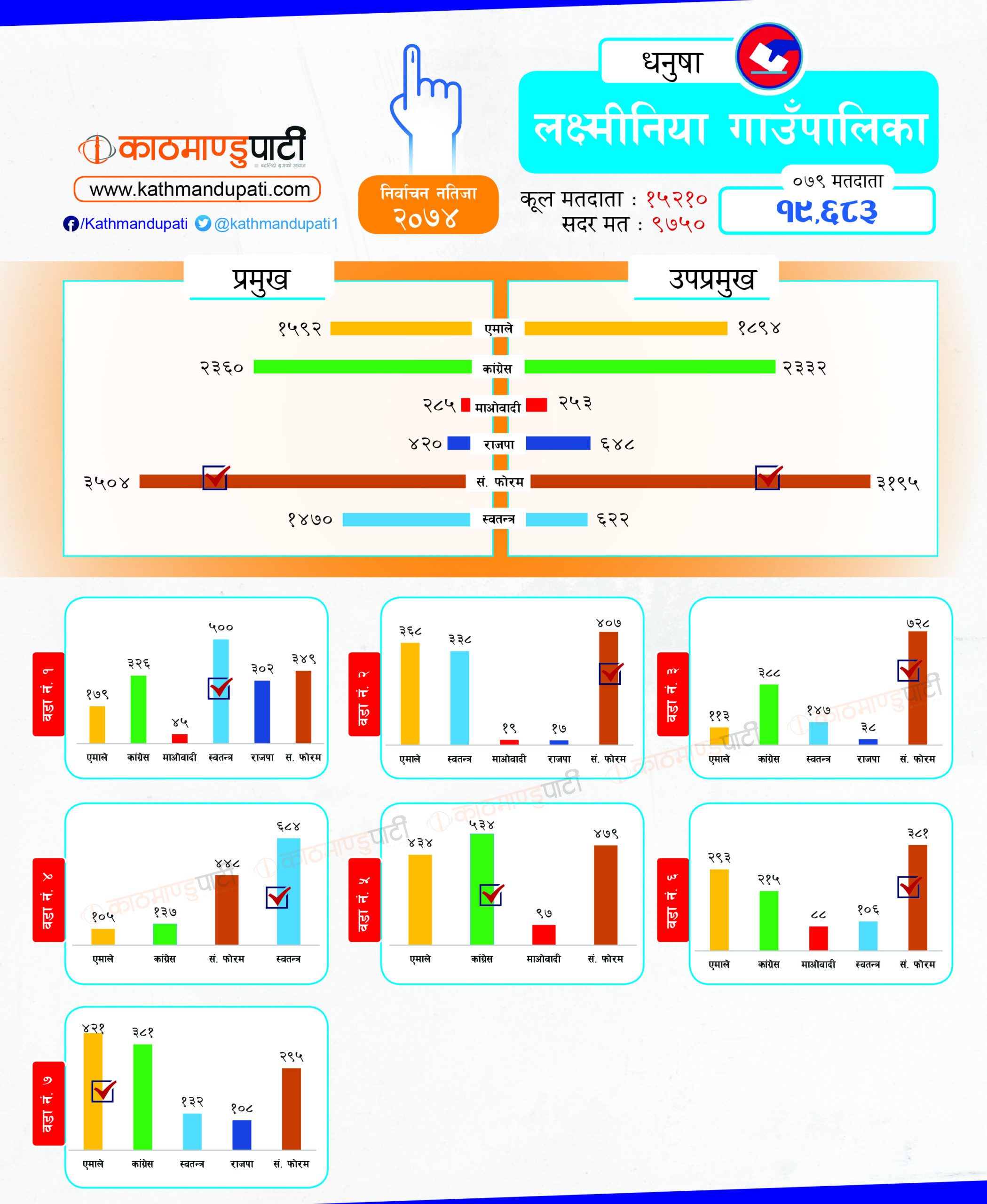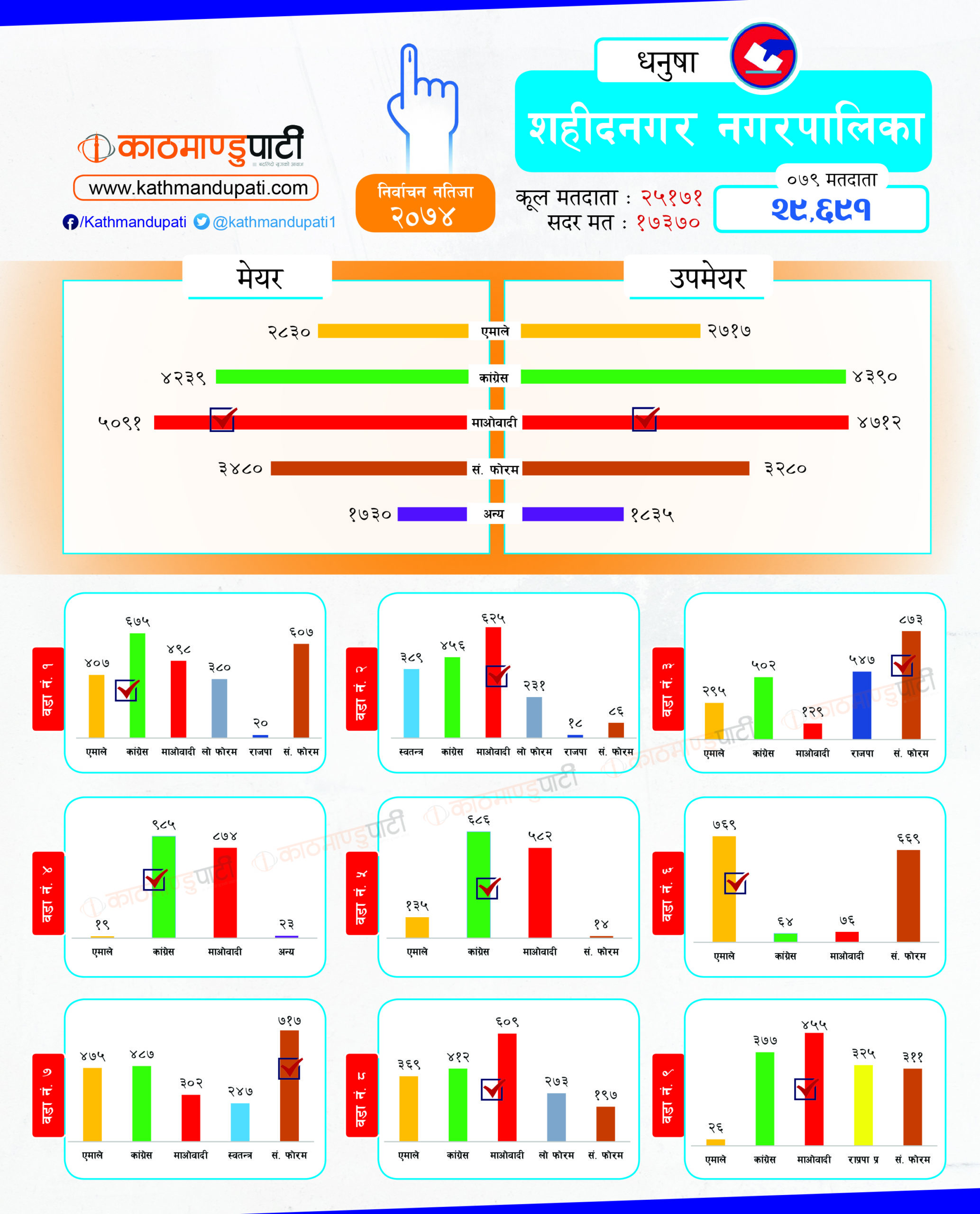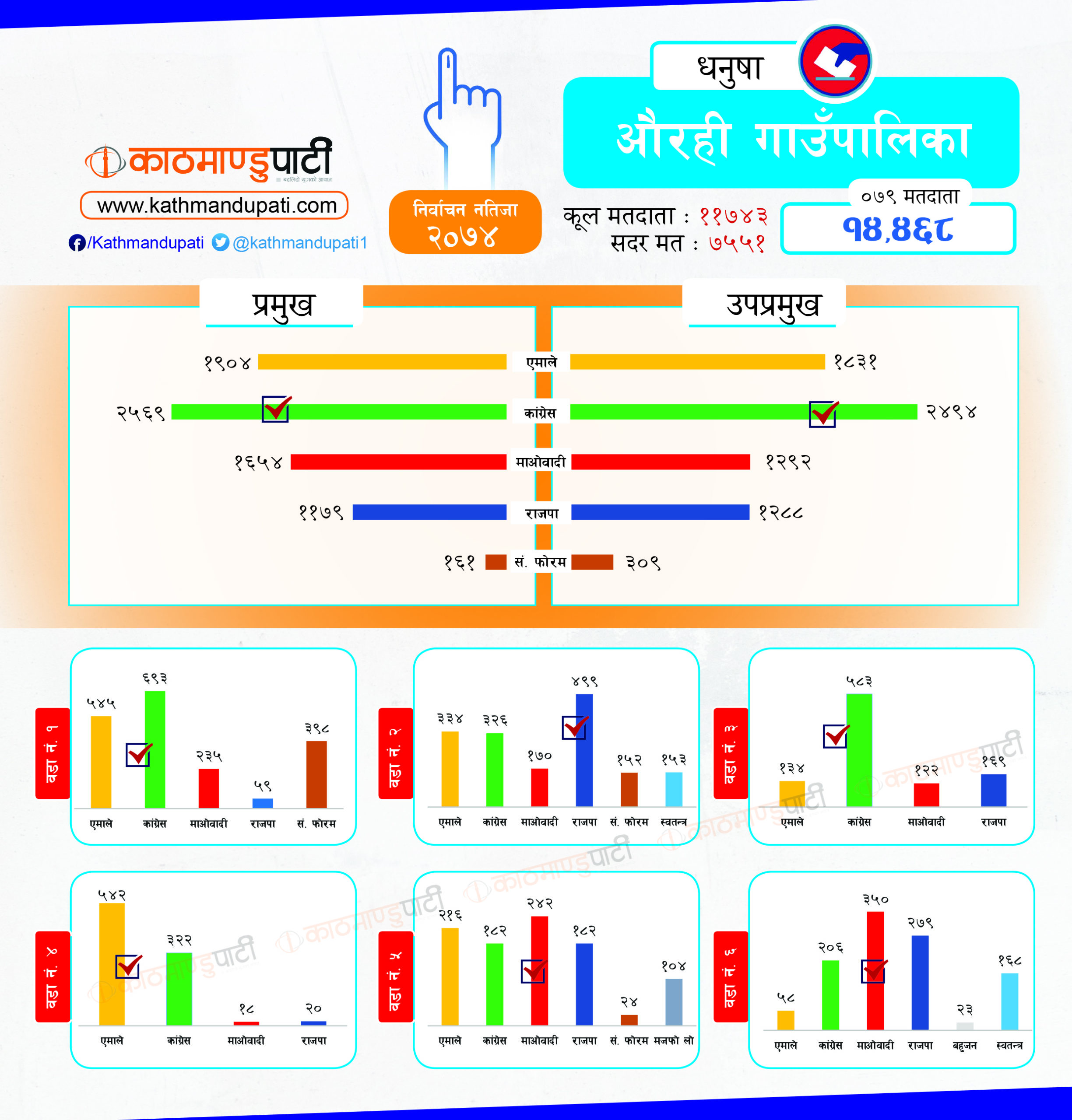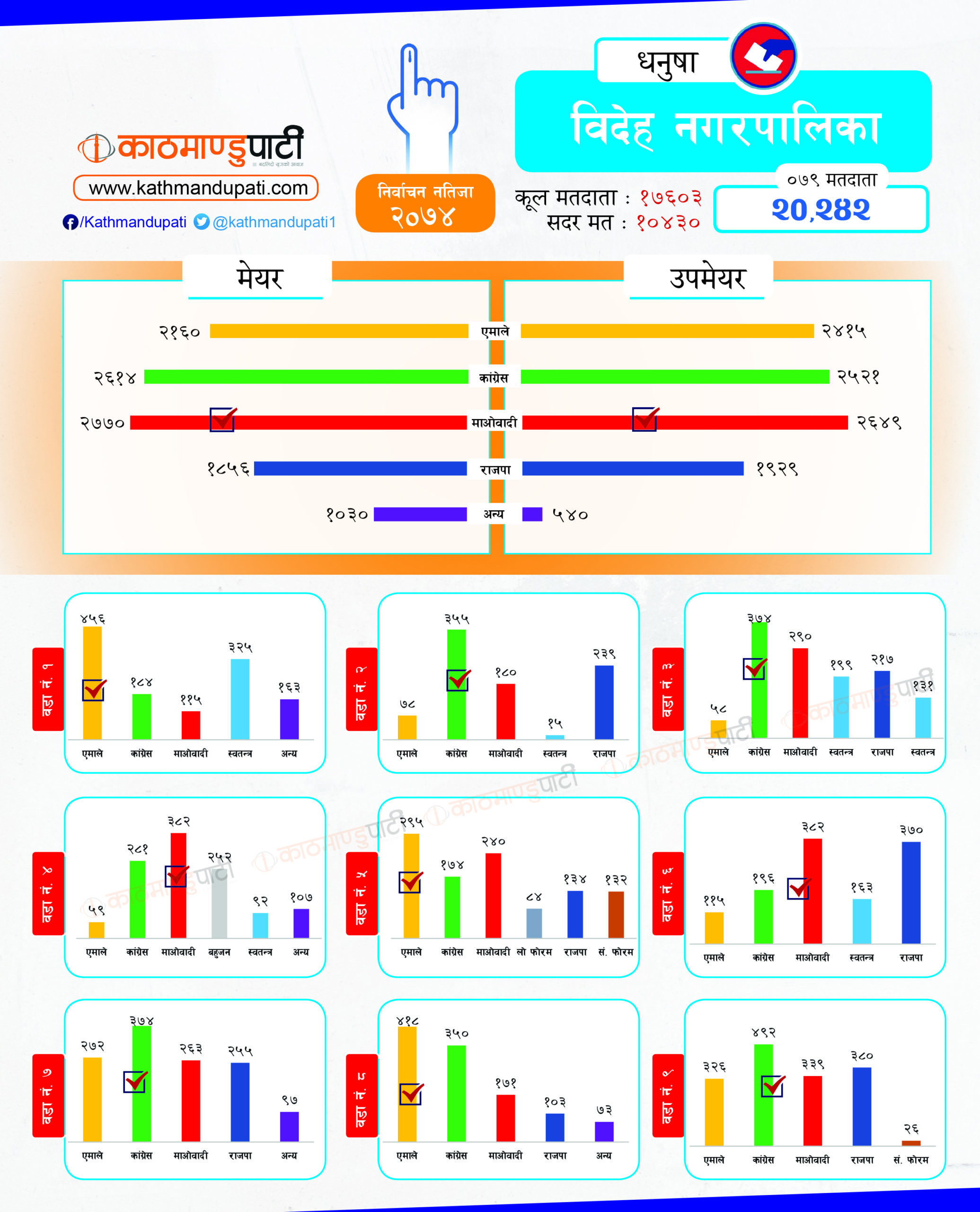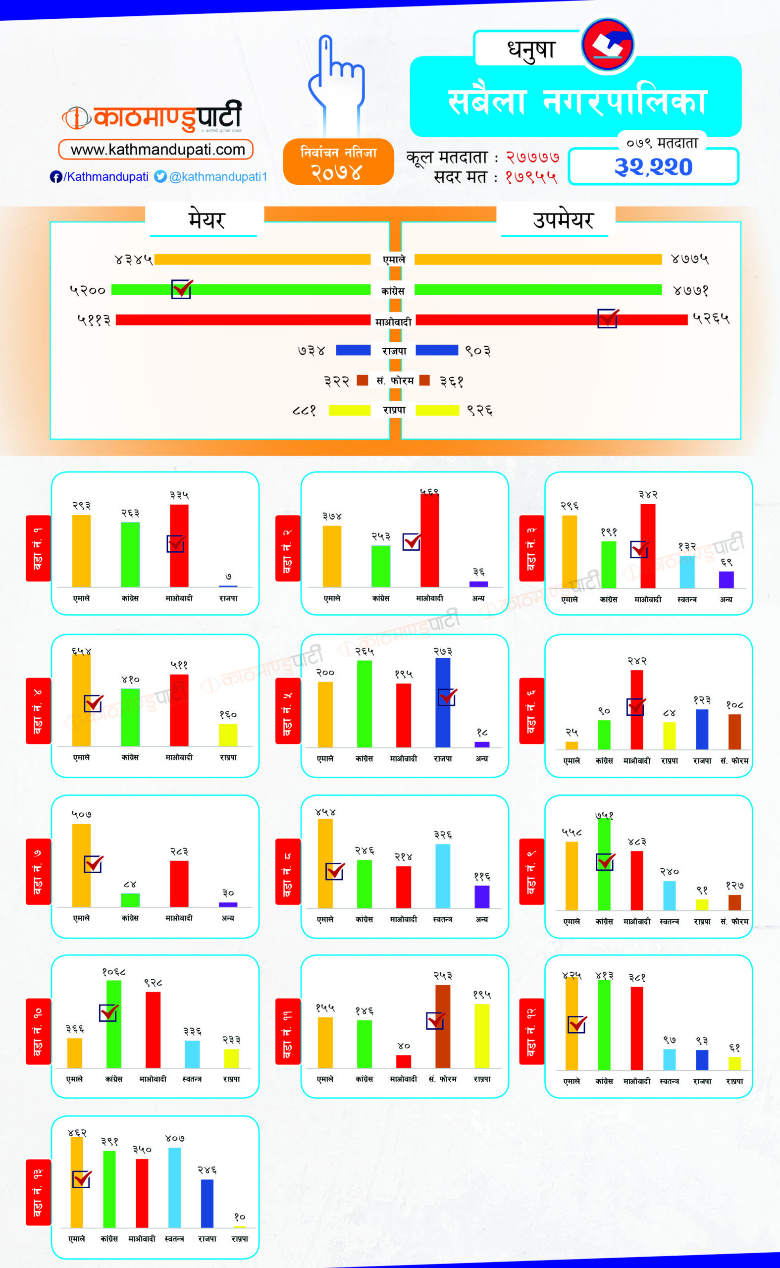 कांग्रेसले कमला, क्षिरेश्वर, धनुषाधाम र नगराइन नगरपालिकामा मेयर–उपमेयर, सबैलामा मेयर तथा औरही, जनकनन्दिनी र धनौजी गाउँपालिकामा अध्यक्ष–उपाध्यक्ष जितेको थियो । एमालेले मिथिला–बिहारी र मिथिला नगरपालिकाको मेयर–उपमेयर तथा बटेश्वर र मुखियापट्टी–मुसहरमिया गाउँपालिकामा अध्यक्ष–उपाध्यक्ष जित्यो ।