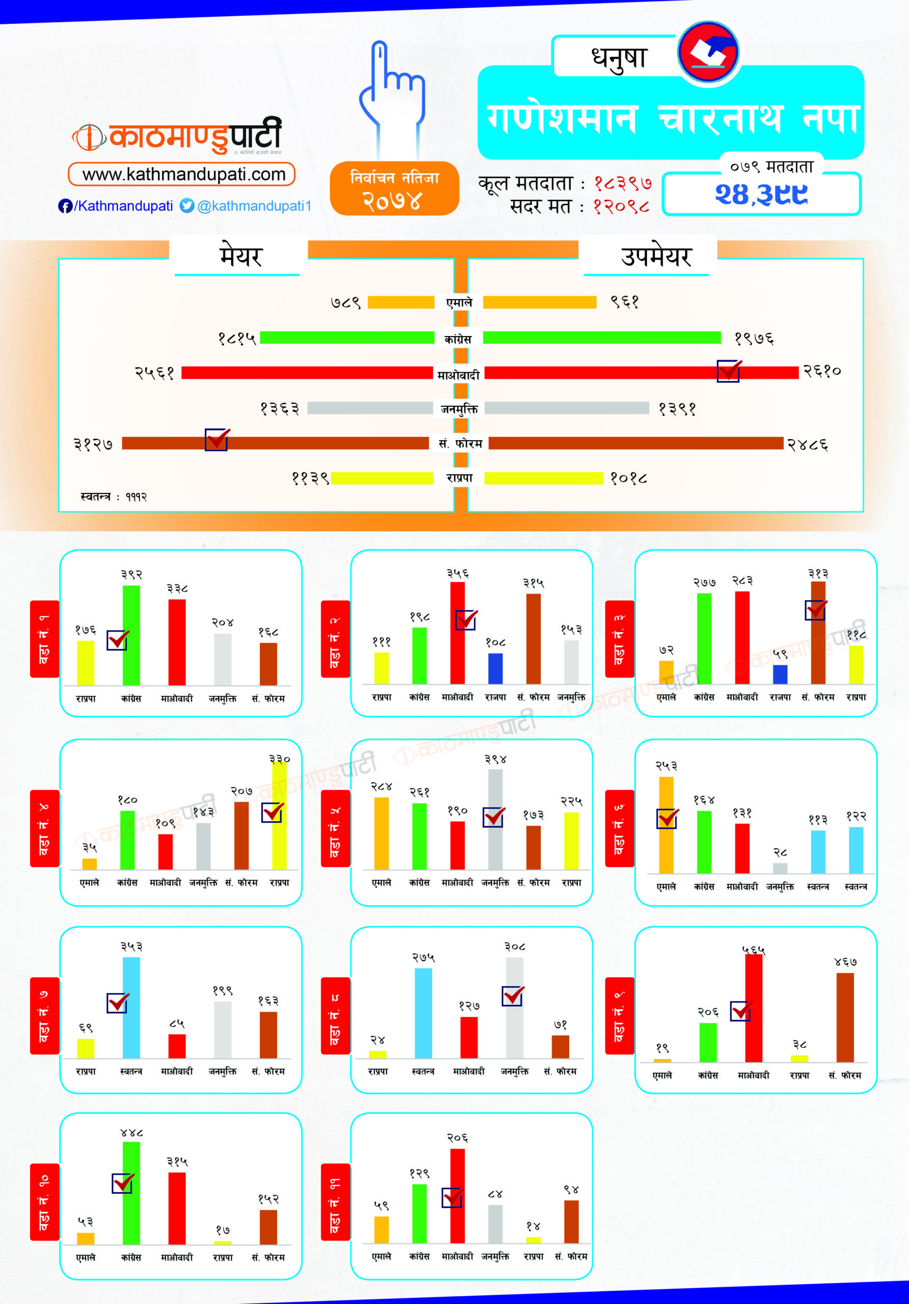 कांग्रेसले जितेकामध्ये अधिकांश पालिकामा मतान्तर फराकिलो छ । तर, केहीमा जसपाले उसलाई समस्यामा पार्न सक्छ । गणेशमान–चारथान नगरपालिकामा जसपा र माओवादीबीच प्रतिस्पर्धा छ । पहिले राजपाले जितेका पालिकामा भने नतिजा उल्टन सक्छ । धनुषामा व्यक्तिगत प्रभावका आधारमा पनि मत जाने भएकाले परिणाम आकलन गर्न गाह्रो छ । तर, समग्रमा कांग्रेस नै ठूलो दल बन्नेमा भने शंका छैन । तर, उसले विगतमा जितेका केही पालिका गुमाउन सक्छ ।