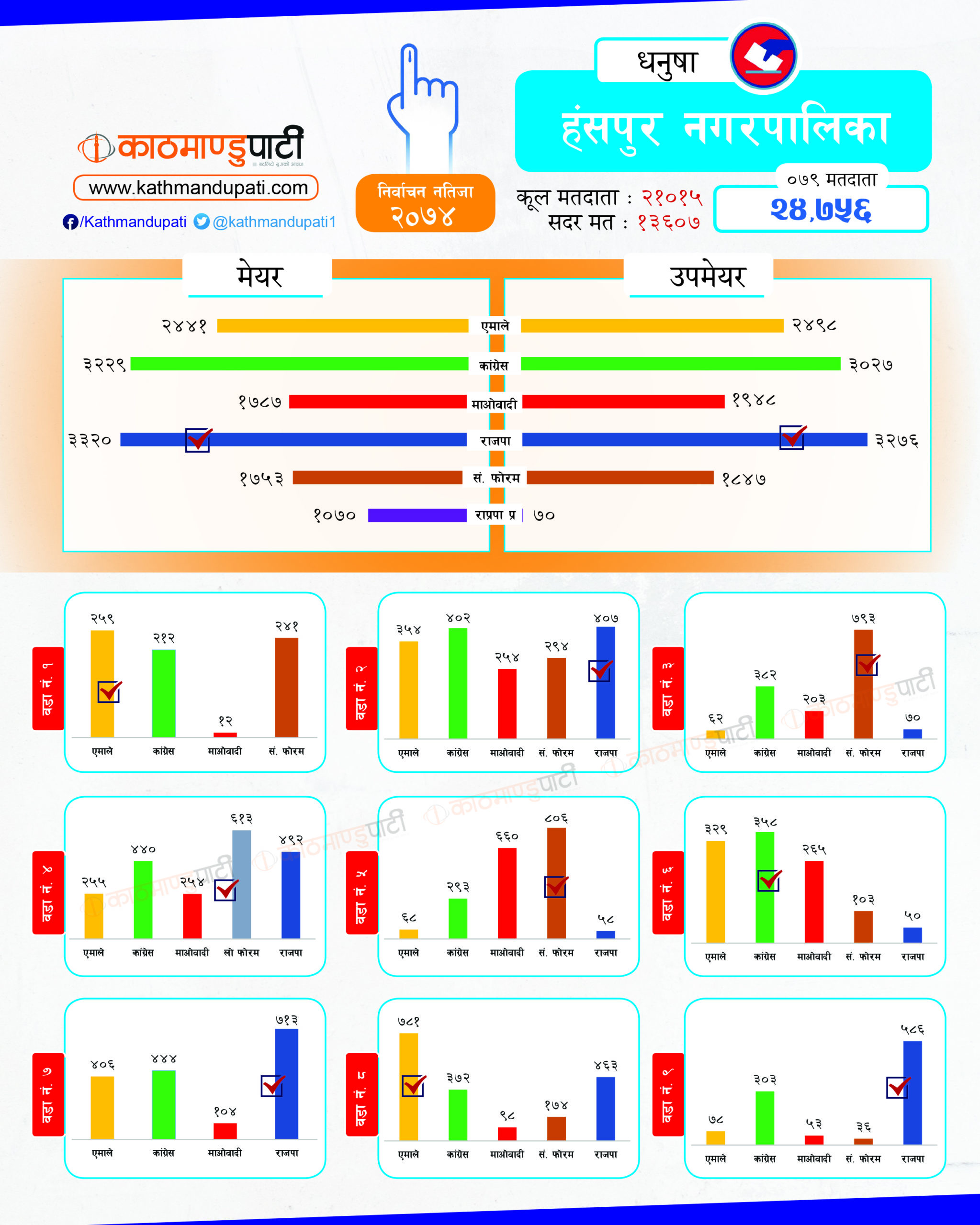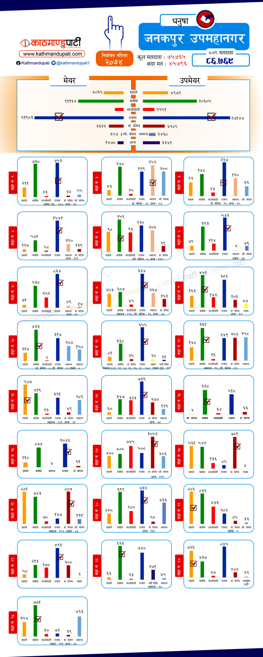 राजपाले जनकपुरधाम उपमहानगरपालिका र हंसपुर नगरपालिकाको मेयर–उपमेयर, माओवादीले विदेह र सहिदनगर नगरपालिकाको मेयर–उपमेयर तथा संघीय समाजवादी फोरमले गणेशमान–चारथान नगरपालिकाको मेयर तथा लक्ष्मीनिया गाउँपालिकाको अध्यक्ष–उपाध्यक्ष जितेको थियो । माओवादीले थप दुई उपप्रमुख पनि जितेको थियो । १६ वटा पालिकामा प्रमुख–उपप्रमुख एउटै दलबाट चुनिएका थिए ।