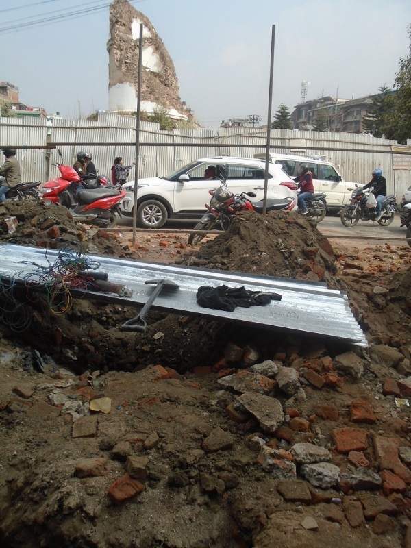 काठमाडौं – २०७२ साल वैशाख १२ गते गएकाे विनाशकारी भुकम्पले भत्केको नेपालको ऐतिहासिक धरोहर धरहरा निर्माण हुनुपर्नेमा यसकै मापदण्ड क्षेत्रभित्र धमाधम व्यापारिक भवन उठाउन जग खनिएको छ । काठमाडौं वडा नं ११ मा अवस्थित धरहराको कम्पाउण्डसँगै सडकको मापदण्डलाई समेत मिचेर भवनको जग खनिएको भन्दै स्थानीय तथा व्यापारीहरु यतिबेला आन्दोलित बनेका छन् ।