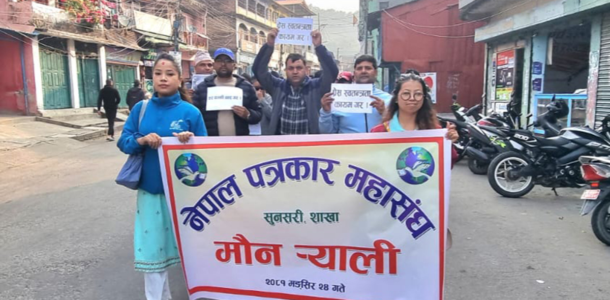 धरान- धरानका मेयर हर्कराज साम्पाङलाइ कारवाहीको माग गर्दै सुनसरीका पत्रकारहरूले आज धरानमा मौन जुलुस प्रदर्शन गरेका छन् । पछिल्लो समय मेयर साम्पाङले पत्रकारहरूलाई धम्की दिँदै आएकाले आफूहरू असुरक्षित रहेको भन्दै मौन उनीहरूले जुलस निकालेका हुन् ।