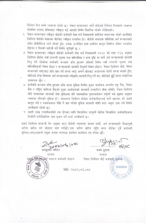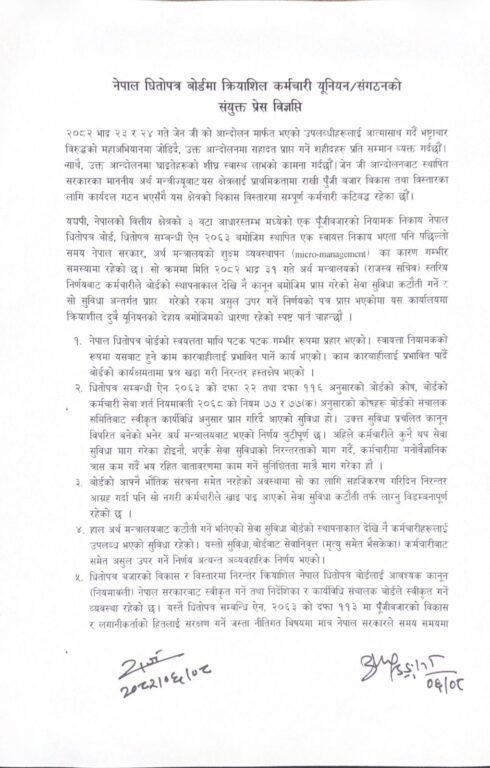 संयुक्त विज्ञप्तिमा बोर्डको स्वायत्तता तथा नियामक क्षमतामा निरन्तर हानिकारक हस्तक्षेप तत्काल रोक्नुपर्ने, राजस्व सचिवस्तरबाट जारी भएको सेवासुविधा कटौती र रकम असुल गर्ने निर्णय तत्काल खारेज गरिनुपर्ने, बोर्डले आफ्नै स्रोतबाट सञ्चालन गर्ने स्वतन्त्र निकायको हैसियत कायम राख्दै सेवासुविधा सम्बन्धी प्रश्नहरू बोर्डको सञ्चालक समिति र सम्बन्धित ऐनअनुसार समाधान गरिनुपर्ने, मन्त्रालय र बोर्डबीच छलफल आवश्यक भए सहमतिपूर्ण र पारदर्शी तरिकाले संवाद सुरु गर्न र कर्मचारीमा उत्पन्न भय तथा अनिश्चय हटाउन नीतिगत सुनिश्चितता दिनुपर्नेछ ।