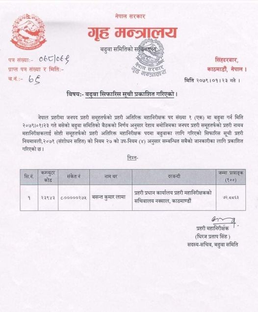 समितिको बैठकको निर्णयअनुसार प्रहरी नियमावली, २०७१ (संशोधनसहित) को नियम २७ को उपनियम (४) अनुसार बढुवा सिफारिस गरिएको समितिका सदस्य–सचिव प्रहरी महानिरीक्षक धिरजप्रताप सिंहले जानकारी दिएका छन् ।