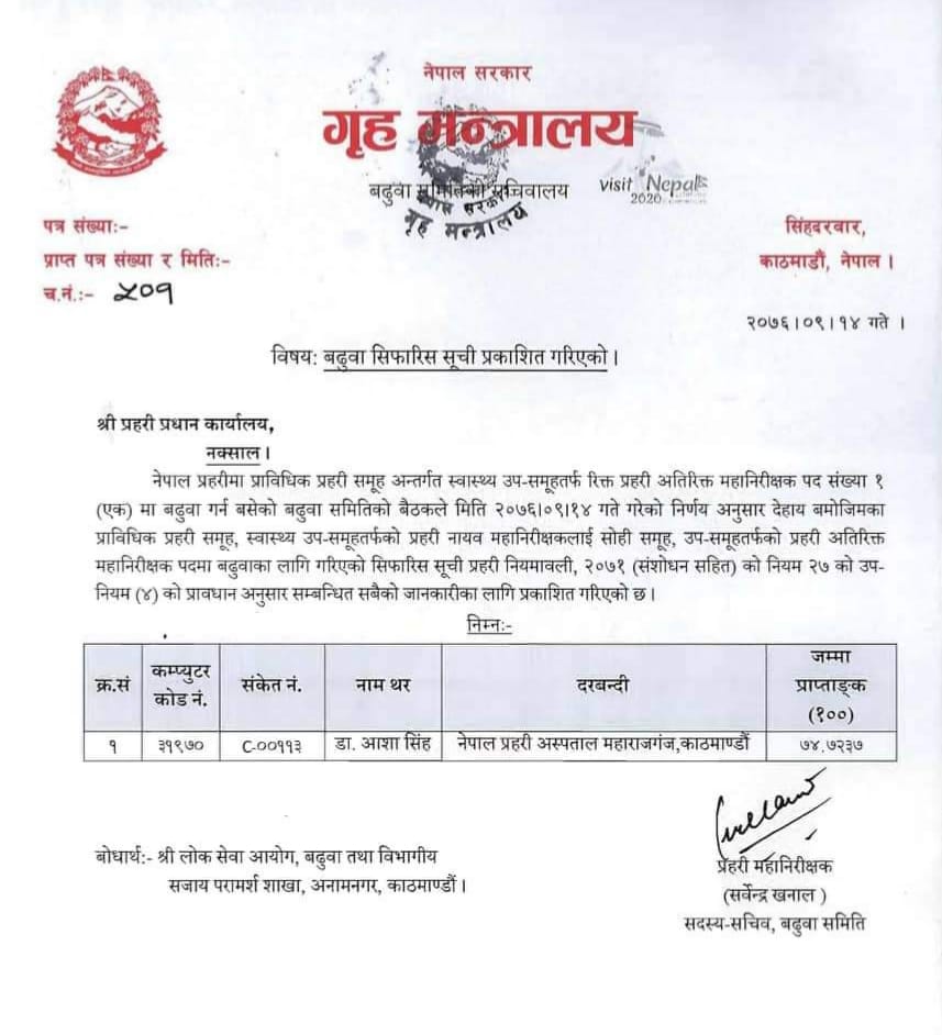 काठमाडौं – नेपाल प्रहरीका प्राविधिक डीआईजी डा. आशा सिंह एआईजी (प्रहरी अतिरिक्त महानिरीक्षक) पदमा बढुवाका लागी सिफारिस भएकी छन् । वरिष्ठ स्त्री रोग विशेषज्ञ रहेकी डा. सिंह प्राविधिक प्रहरी उप–समूह अन्तर्गत रिक्त रहेको एआईजीमा बढुवा भएकी हुन् ।
