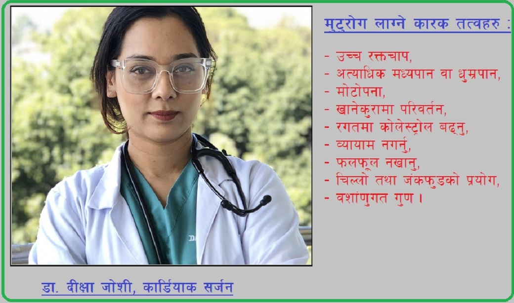 नेपालको पहिलो महिला कार्डियाक सर्जन डा. दीक्षा जोशी पछिल्लो समय हृदयाघात, भल्भमा प्वाल, बाथ, उच्च रक्तचाप, मधुमेहलगायत मुटुसँग सम्बन्धित रोगहरु बढ्दै गइरहेको बताउँछिन् ।
