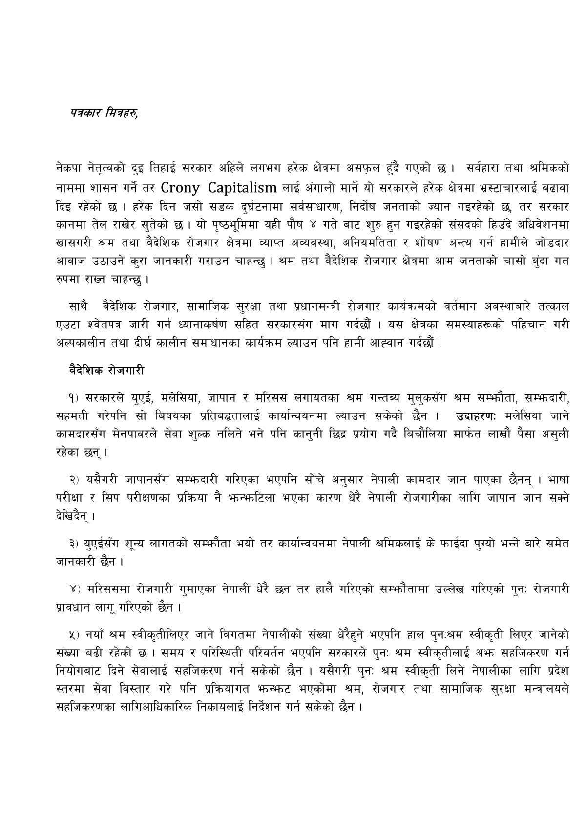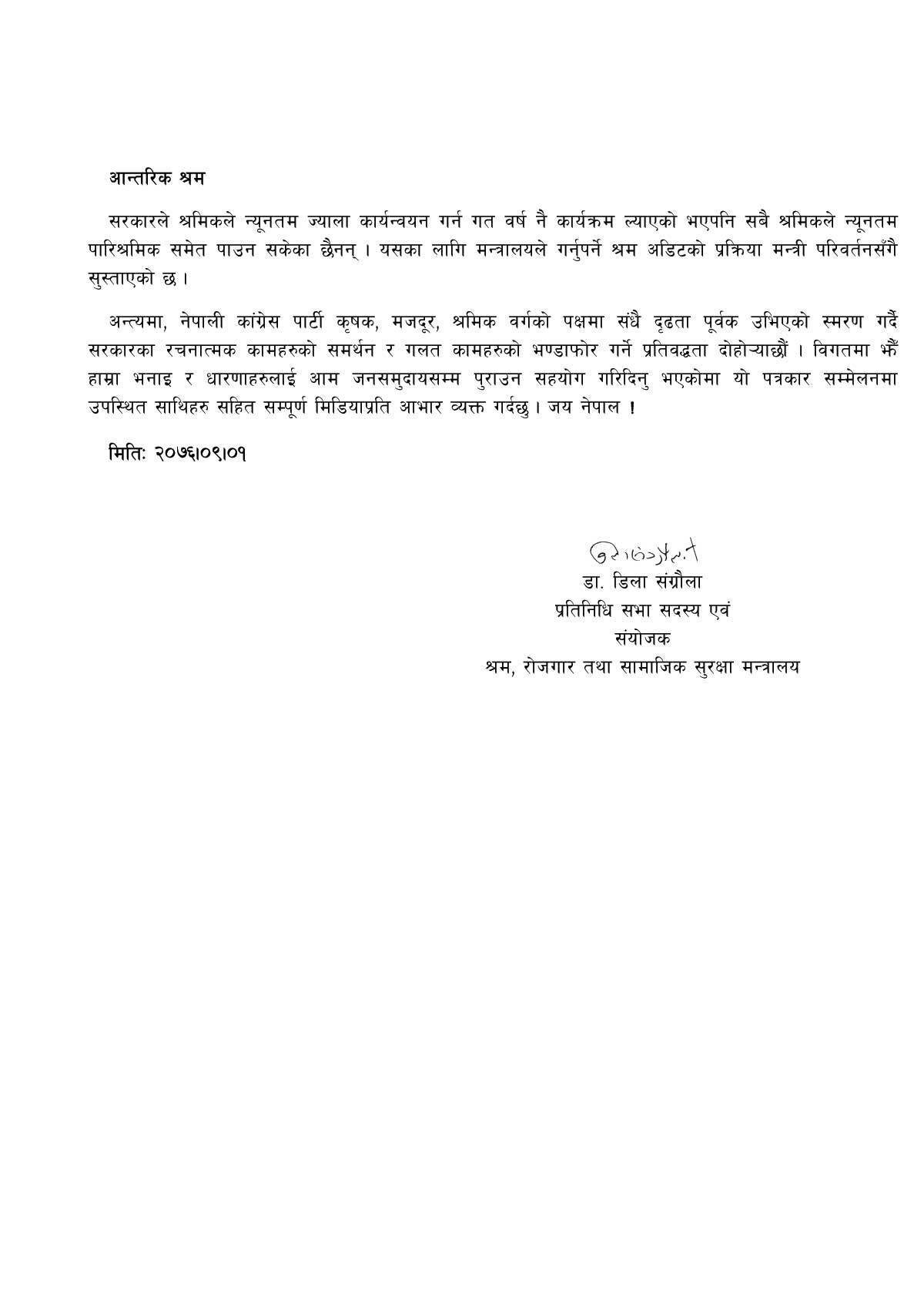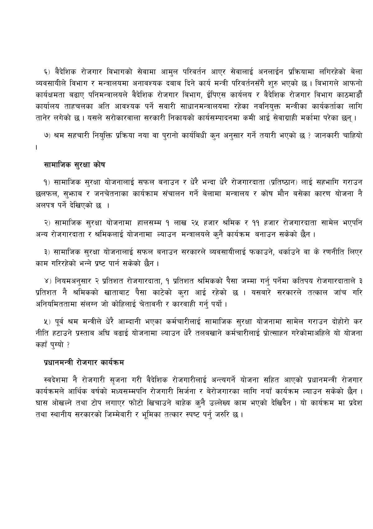 उनले वैदेशिक रोजगारमा ‘फ्रि भिसा फ्रि टिकट’ एजेन्डा माथि पनि सरकारले काम नगरेको आरोप लगाइन् । उनले श्रमिकहरुले न्यूनतम पारिश्रमिक नपाएको भन्दै मन्त्रीसँग जवाफ मागेको उनले बताइन् ।