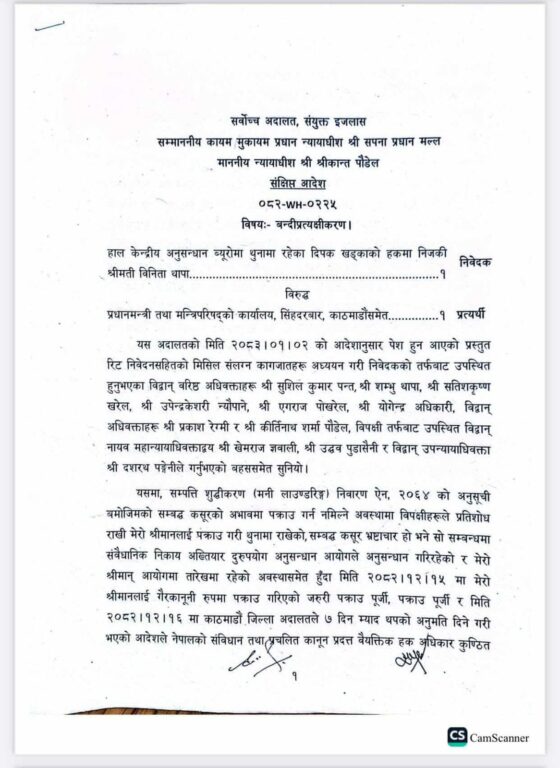 बिहीबार कायममुकायम प्रधानन्यायाधीश सपना प्रधान मल्ल र न्यायाधीश श्रीकान्त पौडेलको संयुक्त इजलासले श्रीमती विनिता थापाले दायर गरेको निवेदनमा सुनुवाइ गर्दै खड्कालाई थुना बाहिरै राखेर अनुसन्धान गर्न भनेका छ ।