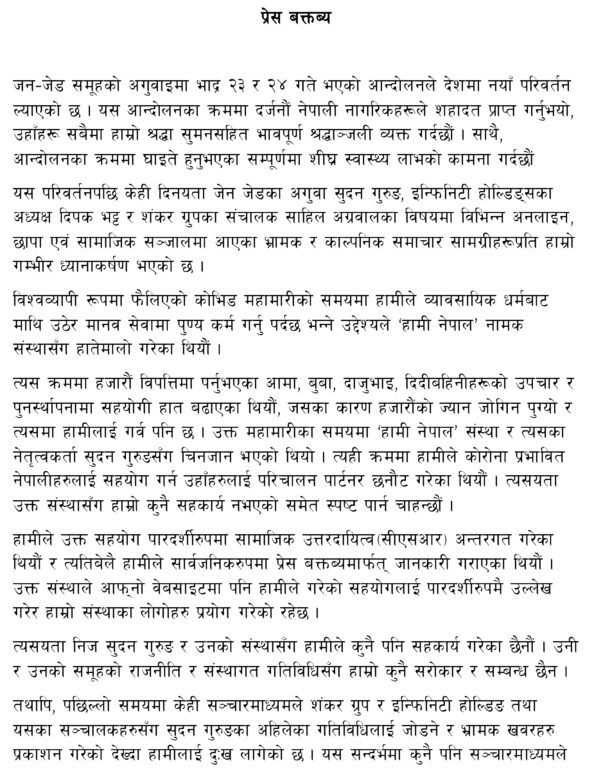 ‘सुदन गुरुङ र उनको संस्थासँग हालको राजनीतिक गतिविधि वा अन्य कुनै संस्थागत सम्बन्ध हाम्रो छैन,’ विज्ञप्तिमा भनिएको छ । तर पछिल्ला दिनमा केही सञ्चारमाध्यमहरूले उनीहरूको नामलाई जेनजी आन्दोलनसँग जोडेर भ्रामक समाचार प्रवाह गरेको भन्दै खेद प्रकट गरिएको छ ।