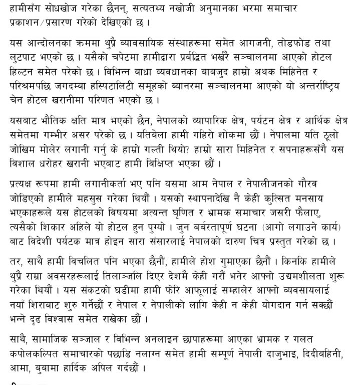 आन्दोलनकै क्रममा व्यावसायिक संस्थाहरूमा भएको तोडफोड र आगजनीबाट उनीहरूलाई पनि ठूलो क्षति पुगेको विज्ञप्तिमा उल्लेख छ । विशेषगरी जगदम्बा हस्पिटालिटी समूहको ब्यानरमा सञ्चालनमा आएको अन्तर्राष्ट्रिय होटल ‘हिल्टन’ सम्पूर्ण रूपमा आगलागीमा नष्ट भएको र यसले पर्यटन, व्यापार र मुलुकको समग्र छविमा गम्भीर धक्का पुगेको उनीहरूको भनाइ छ ।