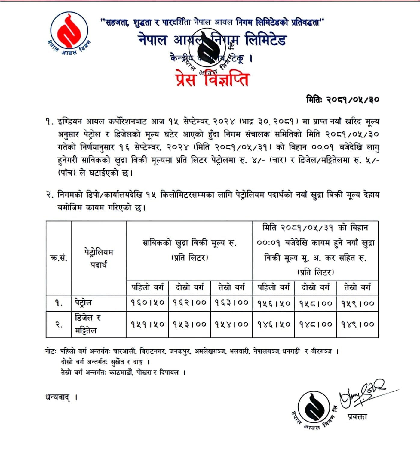 निगमले निकालेको विज्ञप्तिअनुसार पेट्रोलमा प्रतिलिटर ४ र डिजेल/मट्टितेलमा ५/५ रुपैयाँले मूल्य घटेको जनाएकाे छ ।