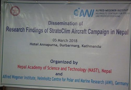 काठमाडौँ – जर्मनको अल्फट बेलना इच्चियुटको स्टाचु क्लिन परियोजनाको आयोजनामा र विज्ञान तथा प्रविधि प्रज्ञा–प्रतिष्ठान ‘नास्ट’ काे सहयोगमा समुद्री सहतबाट २० किलोमिटर माथि हुने जलबायु परिवर्तन सम्बन्धि एक कार्याक्रम काठमाडौँमा सम्पन्न भएको छ ।