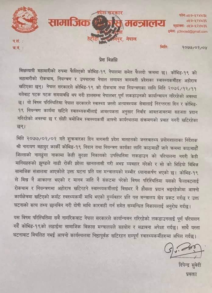 मन्त्रालयले भनेको छ, ‘सुरक्षा निकायकै उपस्थितिमा लकडाउनको पालना नगरी केही झुण्डले गाडी रोकी, झोला खानतलासी गर्ने र अभद्र गरेको र यो भिडियो सामाजिक सञ्जालमा सार्वजनिक भएकोमा मन्त्रालयको गम्भीर ध्यानाकर्षण भएको छ ।’