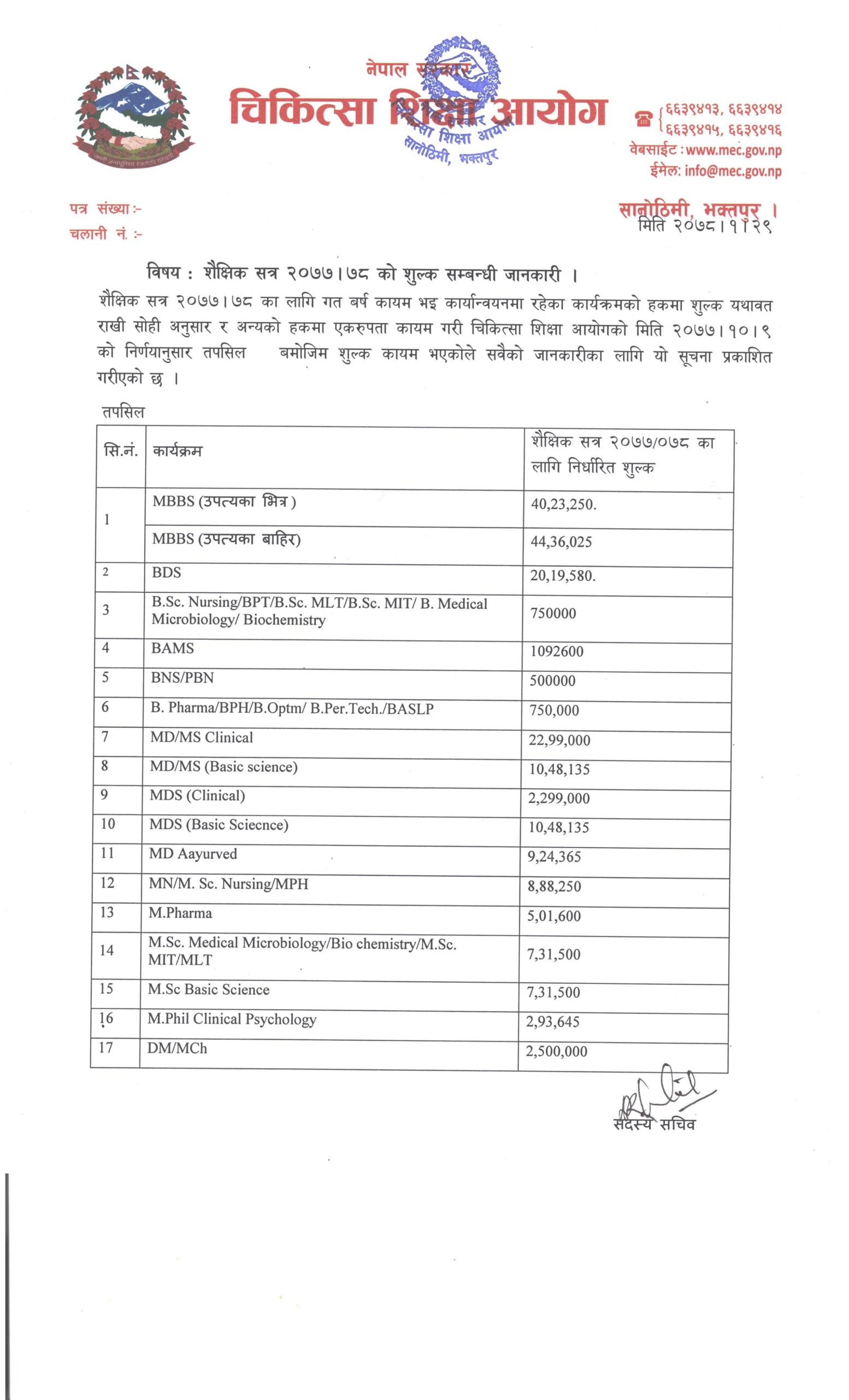 आयोगले एमबिबिएस, बिडिएस, नर्सिङ, आयुर्वेद, फार्मेसी, एमडी/एमएस, एमडिएस, डिएम, एमसिएच लगायतका कार्यक्रमको शुल्क सार्वजनिक गरेको हो ।
