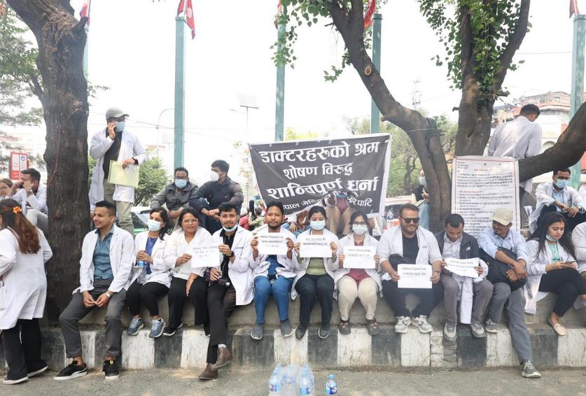 काठमाण्डु– नेपाल मेडिकल कलेज जोरपाटीका आवासीय डाक्टरहरू सडकमा उत्रिएका छन् ।