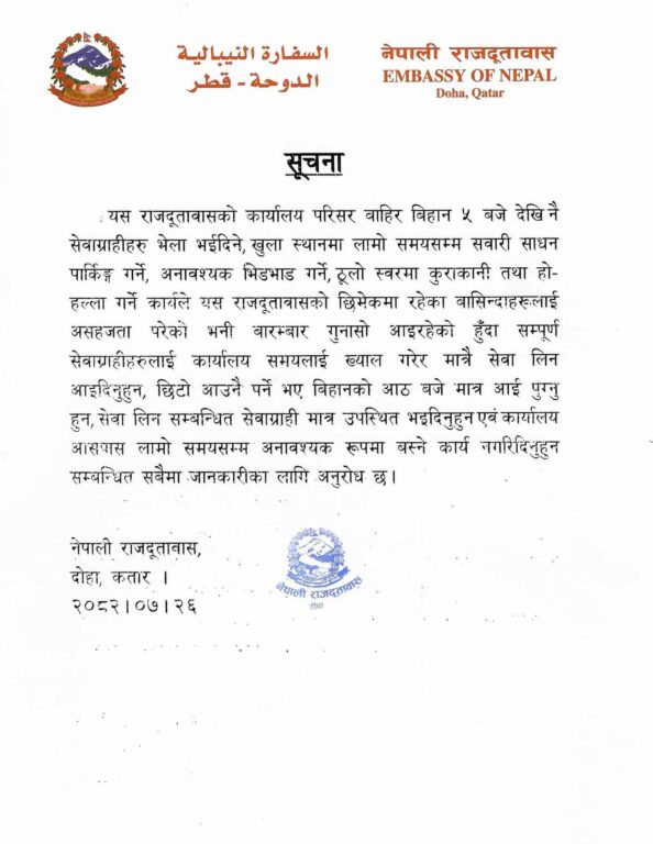 दोहास्थित नेपाली राजदूतावासले बिहान सबेरैदेखि कार्यालय परिसर बाहिर अनावश्यक भीडभाड र होहल्ला गर्ने सेवाग्राहीहरूका गतिविधिबाट आसपासका वासिन्दा प्रभावित भएपछि अनुशासनका लागि सार्वजनिक सूचना जारी गरेको छ ।