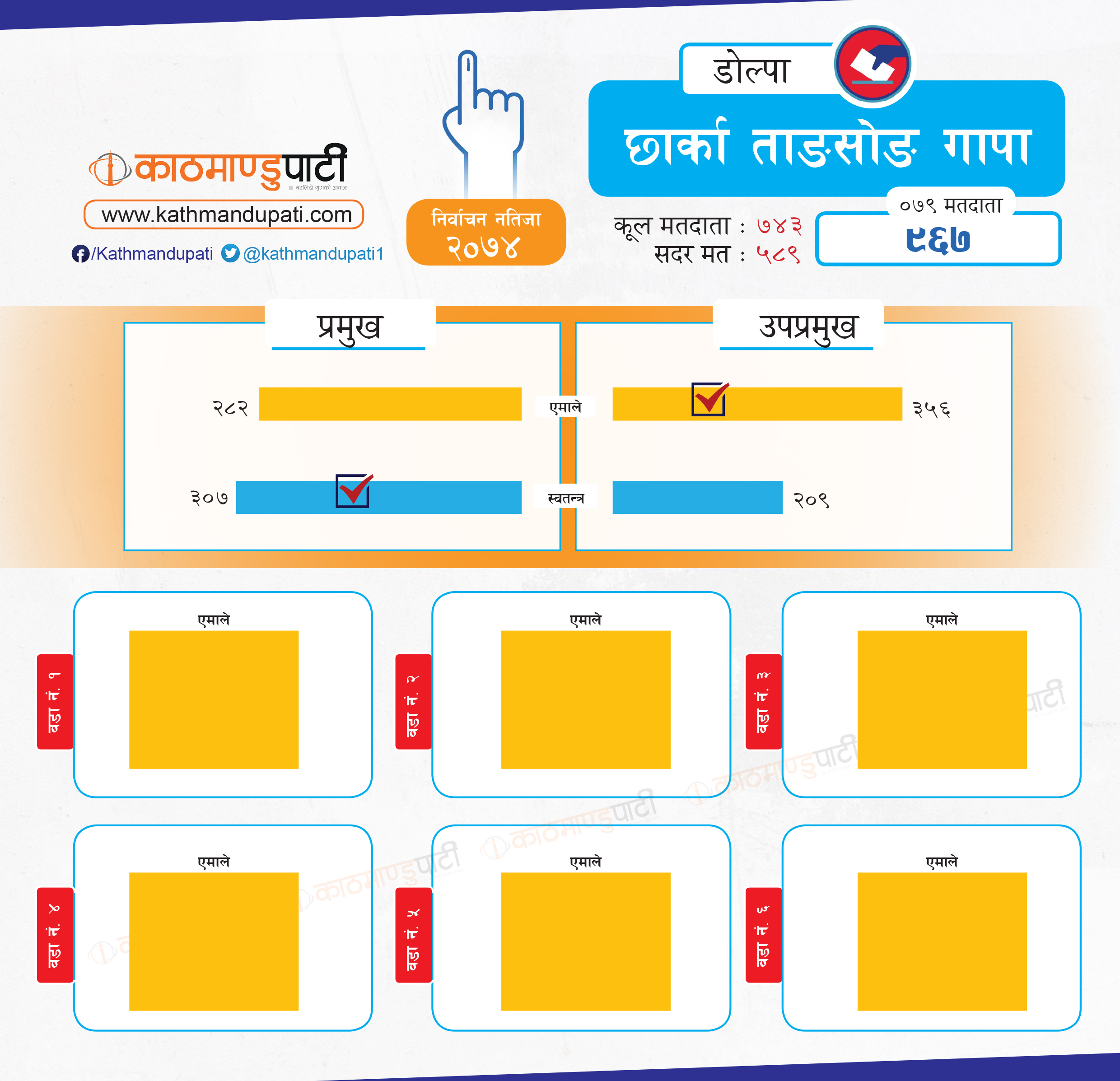 छार्का ताङसोङ गाउँपालिका अध्यक्ष स्वतन्त्र उम्मेदवारले जितेका थिए भने उपाध्यक्ष एमालेले जितेको थियो । अध्यक्ष र उपाध्यक्षका लागि एमाले र स्वतन्त्र मात्रै प्रतिस्पर्धामा थिए । स्वतन्त्रले ३ सय ७ मत ल्याएका थिए भने एमालेका उम्मेदवार २ सय ८२ मत ल्याएर पराजित भएका थिए ।