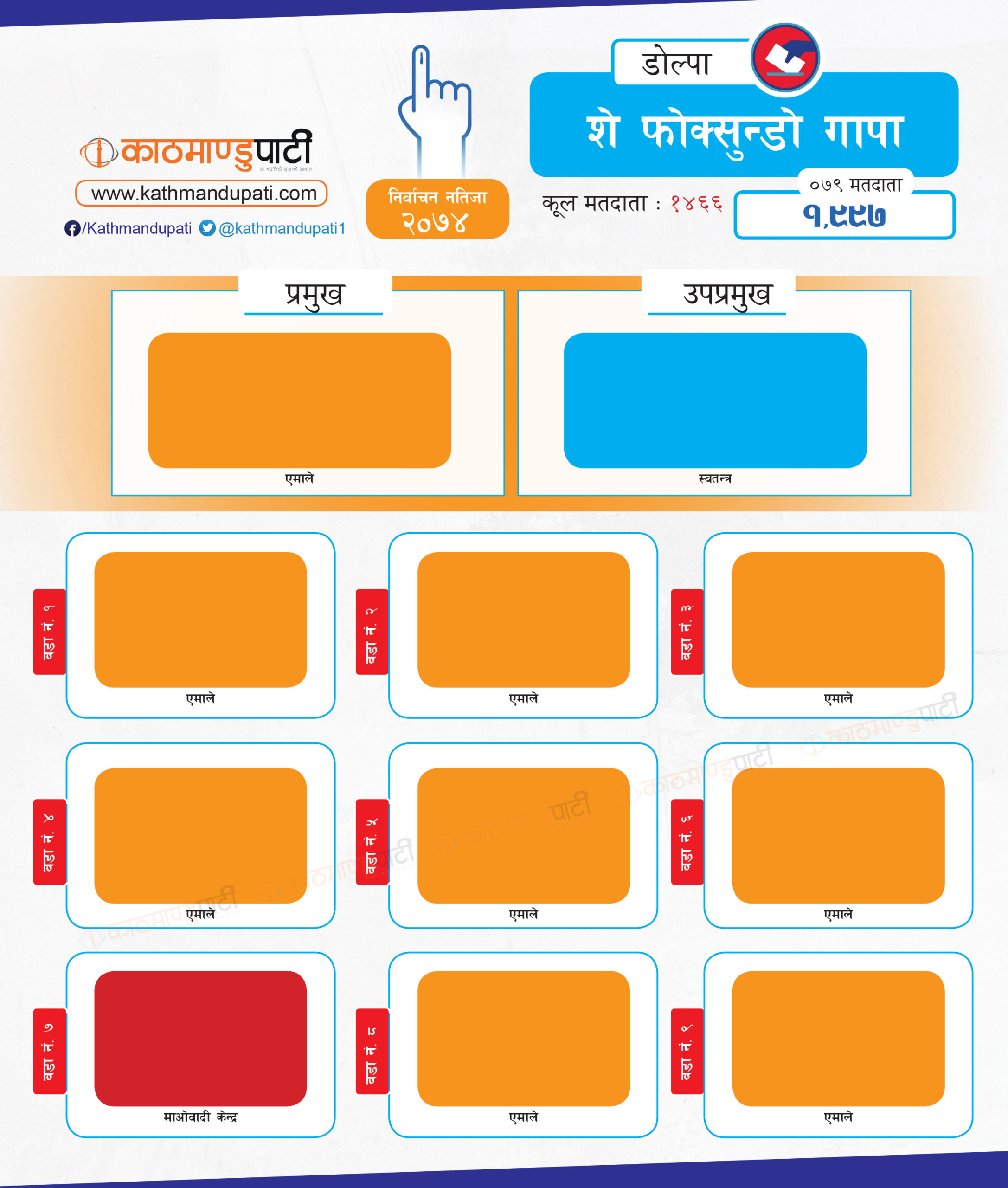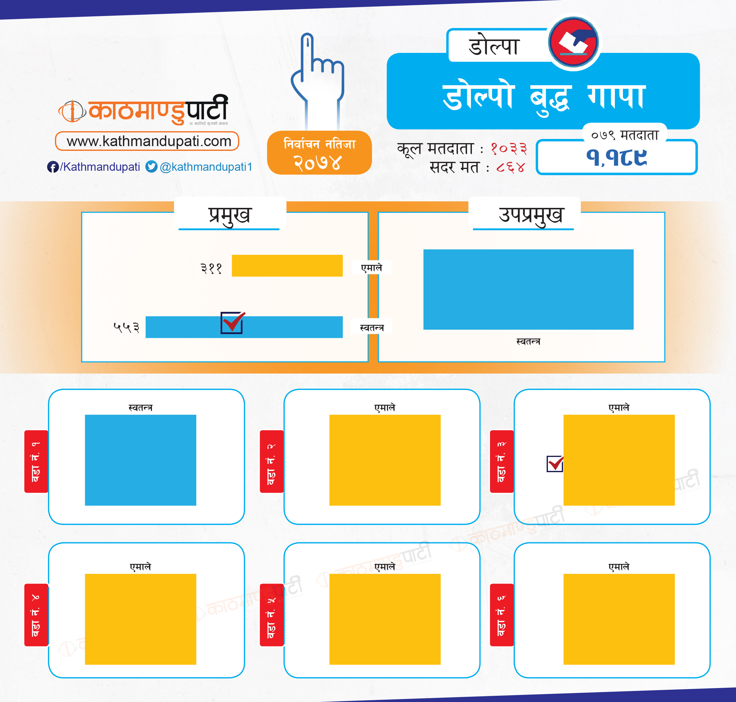 यसबाहेक डोल्पो–बुद्ध गाउँपालिका अध्यक्ष स्वतन्त्रले जितेका थिए । यो पालिकामा स्वतन्त्रले ५ सय ५३ मत ल्याएका थिए भने एमालेका उम्मेदवारले ३ सय ११ मत ल्याएका थिए । उपाध्यक्ष र वडाध्यक्ष सहमतिमा निर्वाचित भएका थिए । त्यसबाहेक शे–फोक्सुण्डो गाउँपालिकामा पनि स्वतन्त्र उम्मेदवारले जितेका थिए ।