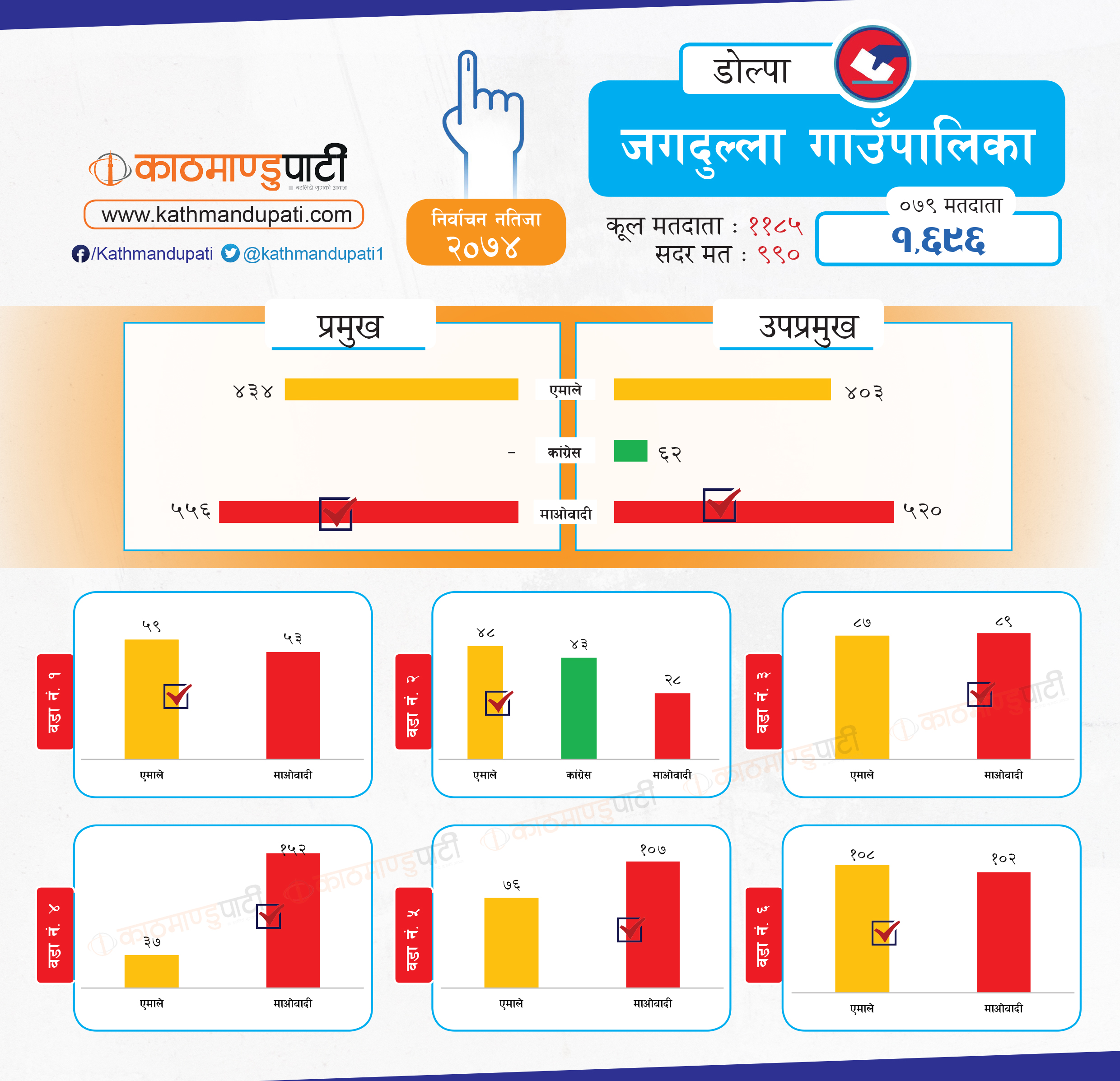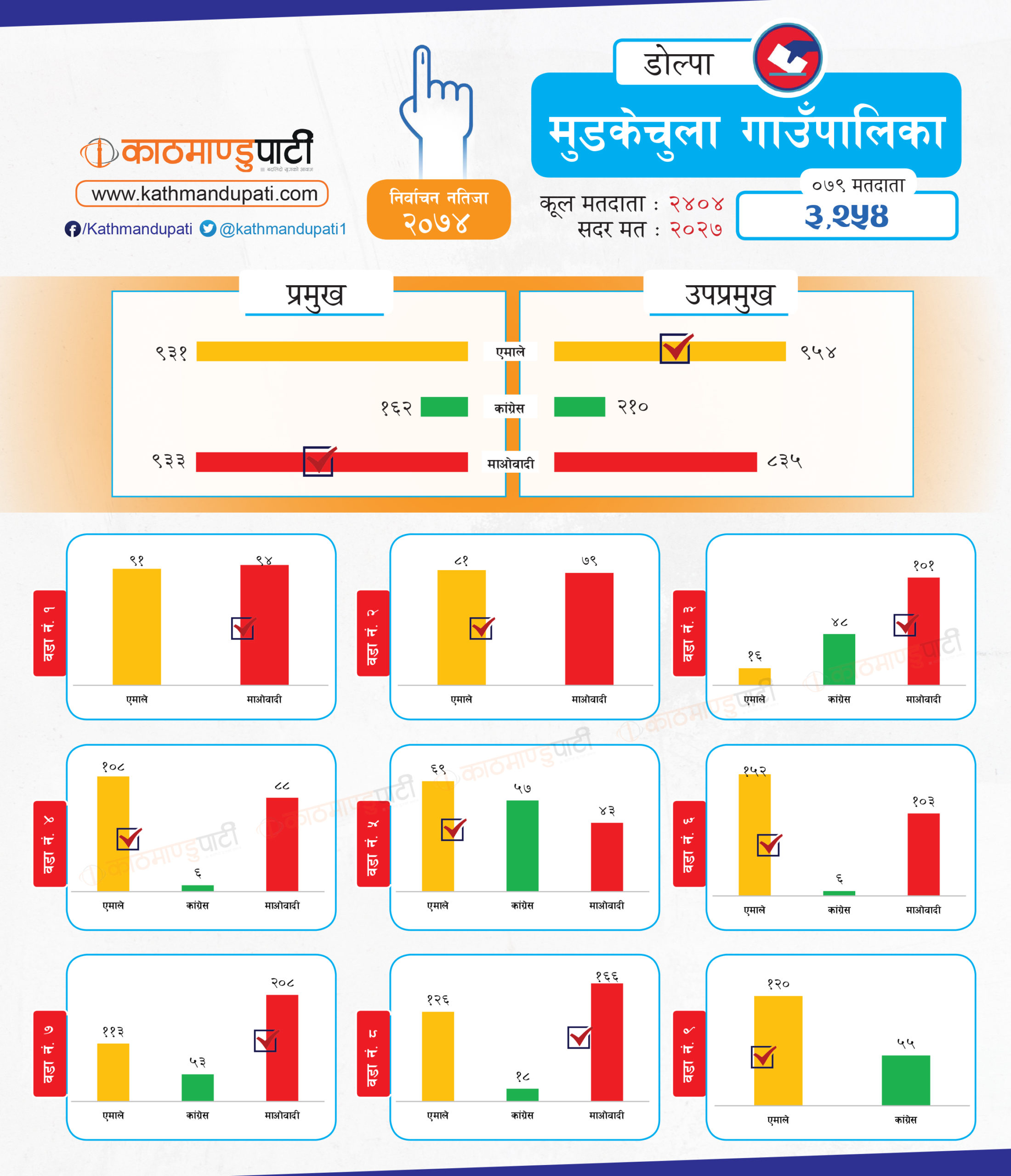 जगदुल्ला र मुड्केचुला गाउँपालिका माओवादी केन्द्रले जितेको थियो । अध्यक्ष र उपाध्यक्ष जितेको माओवादी जगदुल्लामा बलियो देखिन्छ । मड्केचुला गाउँपालिकामा माओवादी उम्मेदवारले २ मतान्तरले जित हासिल गरेका थिए । माओवादी उम्मेदवारले ९ सय ३३ मत ल्याएका थिए भने एमाले उम्मेदवारले ९ सय ३१ मत ल्याएका थिए । उपाध्यक्ष भने एमाले जितेको थियो । त्यसकारण यो पालिकाको चुनावी प्रतिस्पर्धा रोचक बन्ने देखिएको छ । यद्यपि, एमाले विभाजित छ । त्यसको असर पनि जिल्लामा देखिएको छ ।