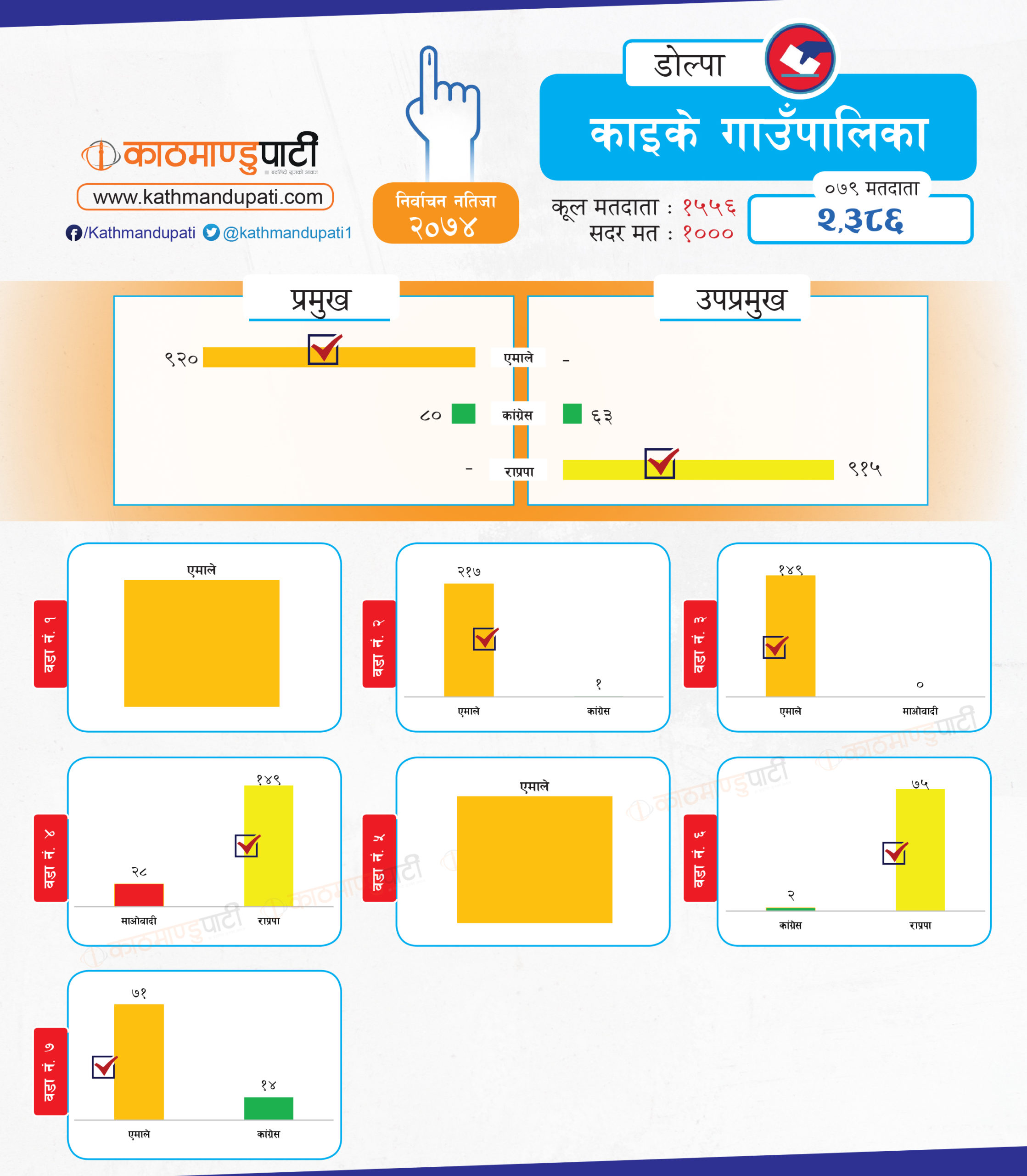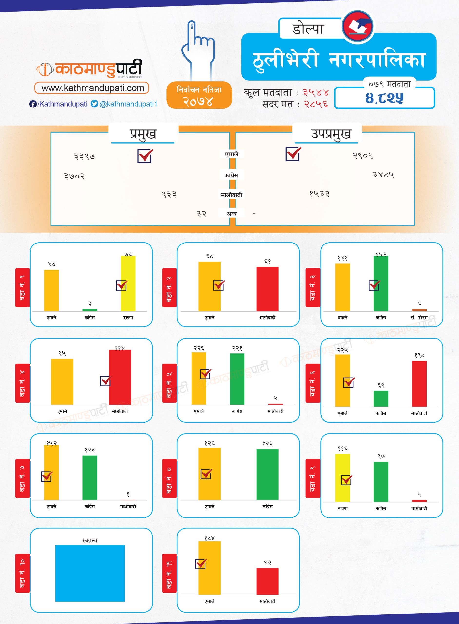 ठूलीभेरी प्रमुखमा एमालेका उम्मेदवारले १ हजार ४ सय ८३ मत ल्याएर निर्वाचित भएका थिए भने कांग्रेसका उम्मेदवारले १ हजार ३ सय ६२ मत ल्याएका थिए । उपप्रमुख जितेका राप्रपा उम्मेदवारले १ हजार ३ सय २४ मत ल्याउँदा माओवादी केन्द्रका उम्मेदवारले १ हजार १ सय ८४ मत ल्याएर पराजित भएका थिए । काइके पालिकामा कांग्रेसका उम्मेदवारले ८० मत ल्याएका थिए ।