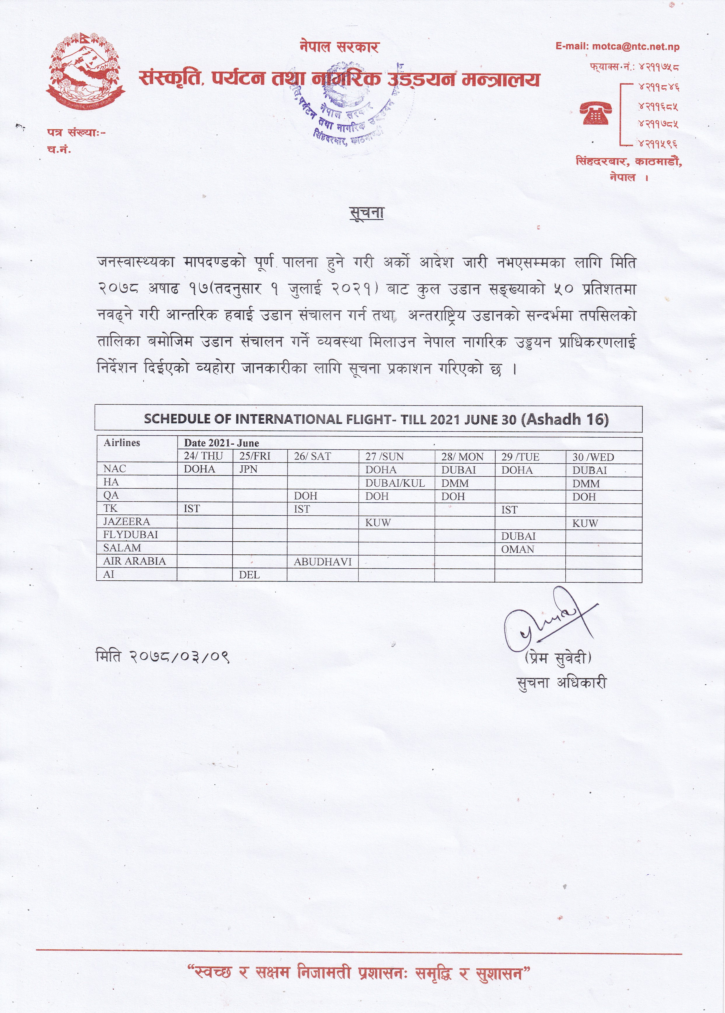 आज नेपाल नागरिक उड्डयन प्राधिकरणलाई विभिन्न वायुसेवा कम्पनीहरुलाई दुईतर्फी उडान स्वीकृति प्रदान गर्ने विषयमा पत्राचार गरेर उक्त जानकारी गराएको हो ।
