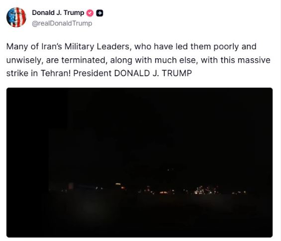 सामाजिक सञ्जाल ट्रुथमा एक भिडियो सार्वजनिक गर्दै राष्ट्रपटि ट्रम्पले तेहरानमा भीषण आक्रमण गरिएको र इरानी सेनाका कयौँ शीर्ष अधिकारी मारिएको दाबी गरेका हुन् ।