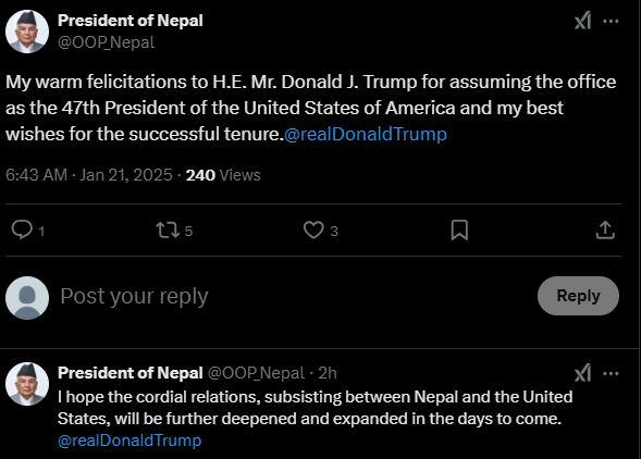 उनले लेखेका छन्, ‘डोनाल्ड ट्रम्पलाई संयुक्त राज्य अमेरिकाको ४७औं राष्ट्रपतिको रूपमा कार्यभार ग्रहण गर्नुभएकोमा हार्दिक बधाई मलाई विश्वास छ कि तपाईंको कार्यकालमा नेपाल र अमेरिकाको बीचको सम्बन्ध अझ प्रगाढ हुनेछ ।’