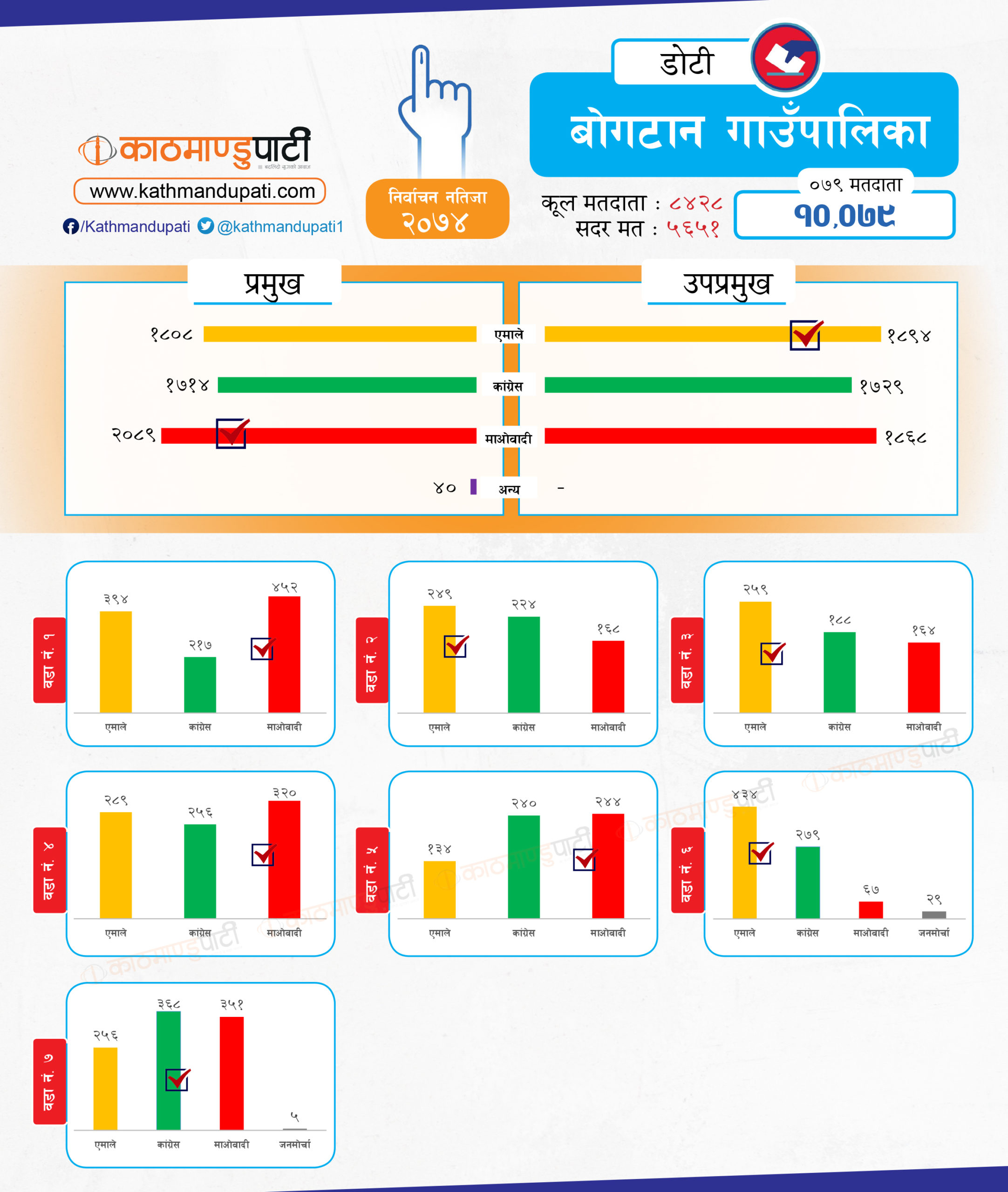 हेर्नुहोस्, डोटीमा ९ स्थानीय तहमा ०७४ को निर्वाचनको वडासम्मकै अंकगणित र थपिएका मतदाताको संख्या इन्फोग्राफमा ।
