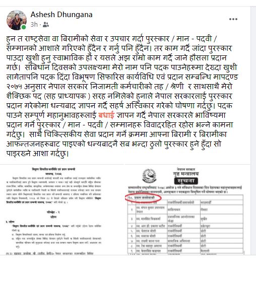 उनले लेखेका छन्, ‘पुरस्कार पाउदा खुसी हुनु स्वाभाविक हो र यसले अझ राम्रो काम गर्दै जाने हौसला प्रदान गर्छ ।’ उनले सरकारले गर्ने पुरस्कार, मान, पदवी तथा सम्मानहरु विवादरहित बनाउनुपर्ने समेत उल्लेख गरेका छन् ।