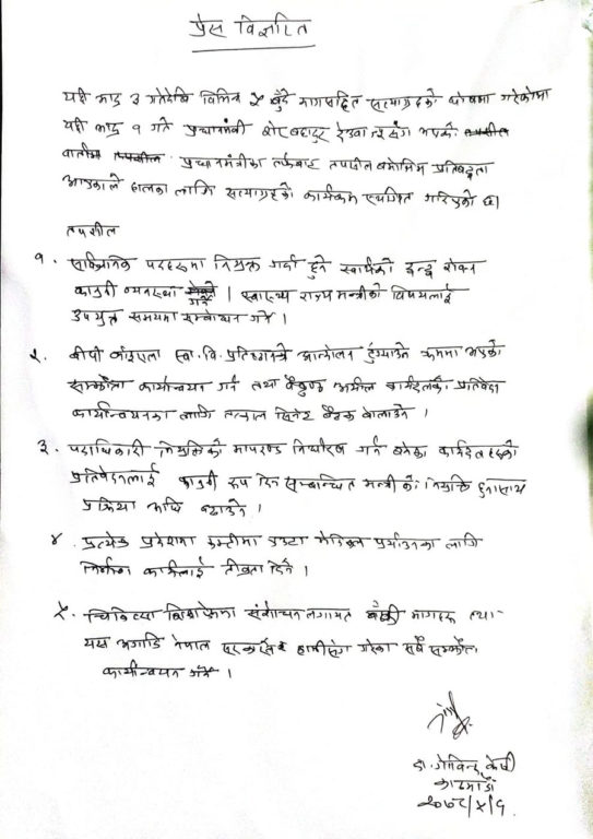 डा. केसीले स्वास्थ्य राज्यमन्त्री उमेश श्रेष्ठलाई पदमुक्त गर्नुपर्ने लगायतका ५ बुंदे माग राखेर भदौ ३ गतेदेखि सत्याग्रहको घोषणा गरेका थिए ।