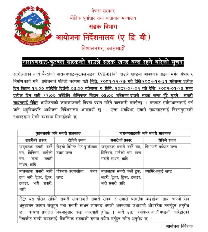 नारायणघाट–बुटवल सडक आयोजनाका अनुसार वैशाख १५ सम्म दाउन्ने खण्डमा राति ११ बजेदेखि बिहान ५ बजेसम्म यातायात सञ्चालनमा रोक लगाइएको छ ।
