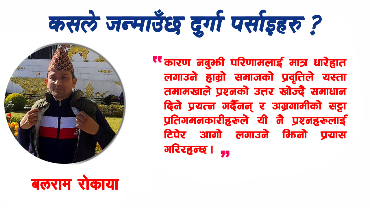 अब मुल प्रश्नमा प्रवेश गरौँ । कसले जन्माउँछ दुर्गा पर्साइहरु ? हो दुर्गा प्रसाईंहरु समय कालखण्डमा हरेक समाजमा जन्मिरहन्छन् । दुर्गा पर्साइहरु जन्मिनुमा समाजको पनि आंशिक भूमिका त रहन्छ नै प्रमुख भूमिका भने राज्यसत्ताको नै रहन्छ ।