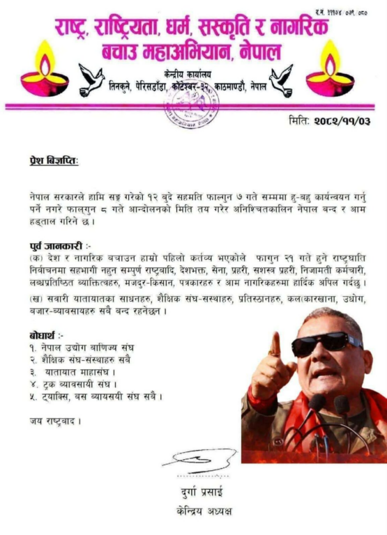 अभियानले गत ३ गते प्रेस विज्ञप्ति जारी गर्दै सरकारसँग भएको १२ बुँदे सहमति कार्यान्वयनका निम्ति दबाब दिने भन्दै फागुन ७ गतेसम्म सम्झौता कार्यान्वयन नगरे ८ गते आन्दोलनको कार्यक्रम तय गरी अनिश्चितकालिन नेपाल बन्द र आमहड्ताल गर्ने बताएको थियो ।
