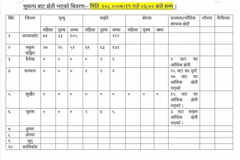 मृत्यु हुनेमा जाजरकोटका १०५ तथा रुकुम पश्चिमका ५२ जना रहेका छन् । सरकारले आज भूकम्प पीडितका लागि विशेष राहतको घोषणा गर्ने तयारी गरेको छ । त्यसका लागि प्रधानमन्त्री पुष्पकमल दाहाल प्रचण्डले बिहान ८ बजेका लागि मन्त्रिपरिषद्को बैठक बोलाएका छन्।