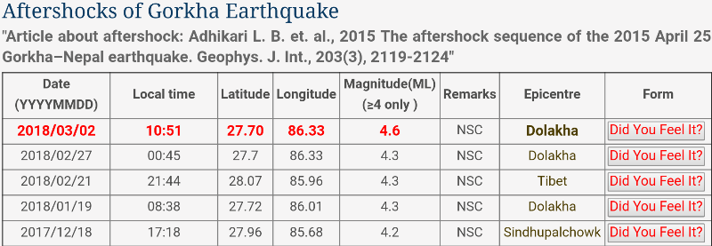 वैशाख १२ मा गएकाे गएको शक्तिशाली गोरखा भूकम्पपछि हालसम्म ४ रिक्टर स्केलभन्दा माथिका ४९१ वटा परकम्प गएको भूकम्प मापन केन्द्रका प्रमुख लोकविजय अधिकारीले जानकारी दिए । ४ रिक्टर स्केलभन्दा मुनिका परकम्प दिनहुँजसो गइरहेका उनले बताए । ४ भन्दा माथिको मात्र रेकर्ड हुने भएकाले साना परकम्पलाई सतर्कताका लागि मात्र विवरण दिने गरिएको छ ।