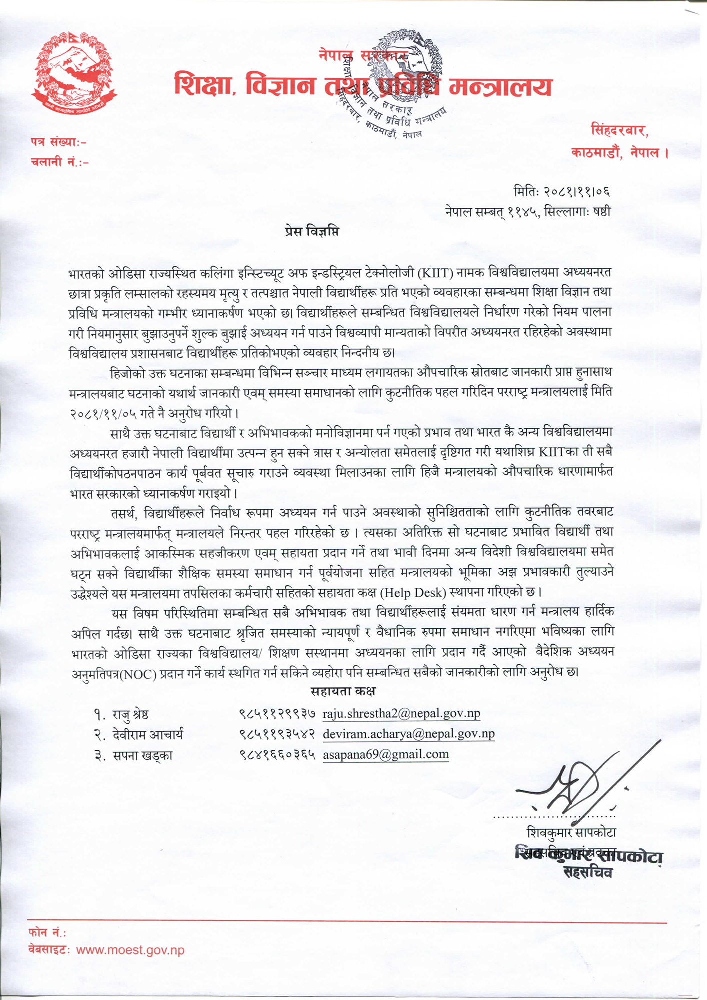 काठमाण्डु – भारतको उडिसास्थित कीट विश्वविद्यालयमा अध्ययनरत विद्यार्थी प्रकृति लम्सालको शंकास्पद मृत्यु र नेपाली विद्यार्थीमाथि भएको दुर्व्यवहारप्रति आपत्ति जनाउँदै शिक्षा, विज्ञान तथा प्रविधि मन्त्रालयले उडिसा राज्यका विश्वविद्यालय र शिक्षण संस्थानमा अध्ययनका लागि प्रदान गर्दै आएको वैदेशिक अध्ययन अनुमतिपत्र (एनओसी) प्रदान गर्ने कार्य स्थगित गर्न सकिने चेतावनी दिएको छ ।