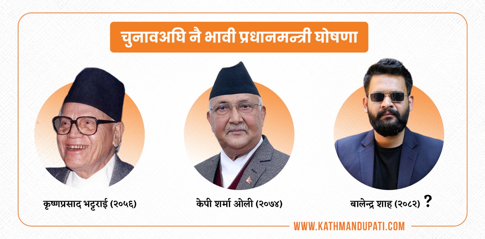 काठमाण्डु – बहुदलीय संसदीय प्रणाली भएको नेपालमा प्रतिनिधिसभा चुनावअघि नै भावी प्रधानमन्त्री घोषणा गर्नुपर्ने बाध्यात्मक अवस्था छैन । तर दलभित्र शक्ति सन्तुलन मिलाउन र मत आकर्षित गर्न भावी प्रधानमन्त्रीको नाम घोषणा गर्ने अभ्यास हुँदै आएको छ ।
