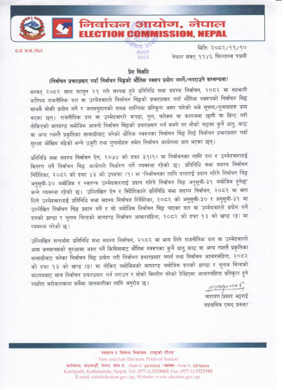 काठमाण्डु – निर्वाचन आयोगले प्रतिनिधिसभा सदस्य निर्वाचन २०८२ को प्रचारप्रसारका क्रममा धातु, काठ वा अन्य सामग्रीबाट बनेका भौतिक स्वरूपका निर्वाचन चिह्नहरू प्रयोग नगर्न राजनीतिक दल र उम्मेदवारहरूलाई कडा निर्देशन दिएको छ ।