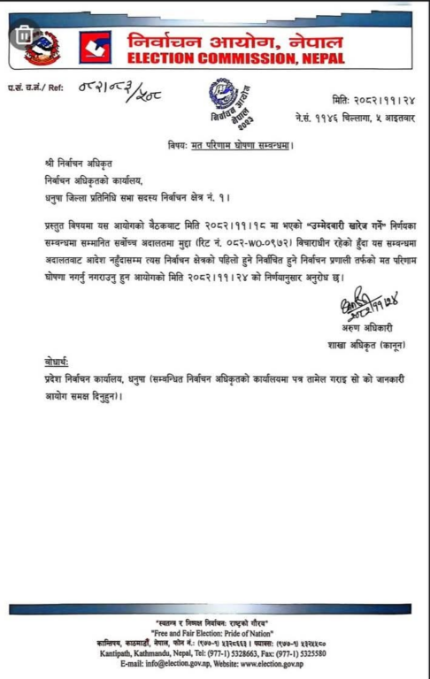 सो निर्णयका सम्बन्धमा सर्वोच्च अदालतमा मुद्दा परी विचाराधीन रहेकाले सो सम्बन्धमा अदालतबाट आदेश नभएसम्म धनुषा जिल्ला निर्वाचन क्षेत्र नम्बर १ को पहिलो हुने निर्वाचित हुने निर्वाचन प्रणालीतर्फको मत परिणाम घोषणा नगर्नु नगराउन आयोगको आईतबारको निर्णयअनुसार अनुरोध गरिएको उनले हस्ताक्षर गरेको पत्रमा उल्लेख छ ।