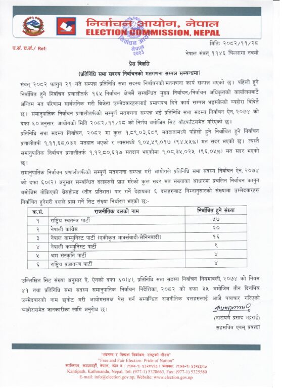 काठमाण्डु – निर्वाचन आयोगले प्रतिनिधिसभा सदस्य निर्वाचनअन्तर्गत समानुपातिकतर्फ मतगणना सकिएसँगै सिट बाँडफाँट गरेको छ ।