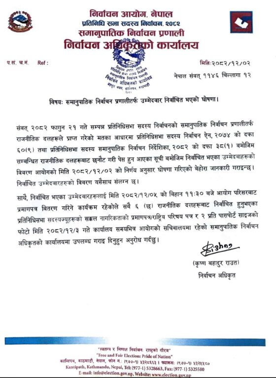 राजनीतिक दलले पाएको मतका आधारमा निर्धारित सिट संख्याभित्र रहने गरी सम्बन्धित दलहरूले गरेको सिफारिसका आधारमा आयोगले निर्वाचित भएको घोषणा गरेको हो ।