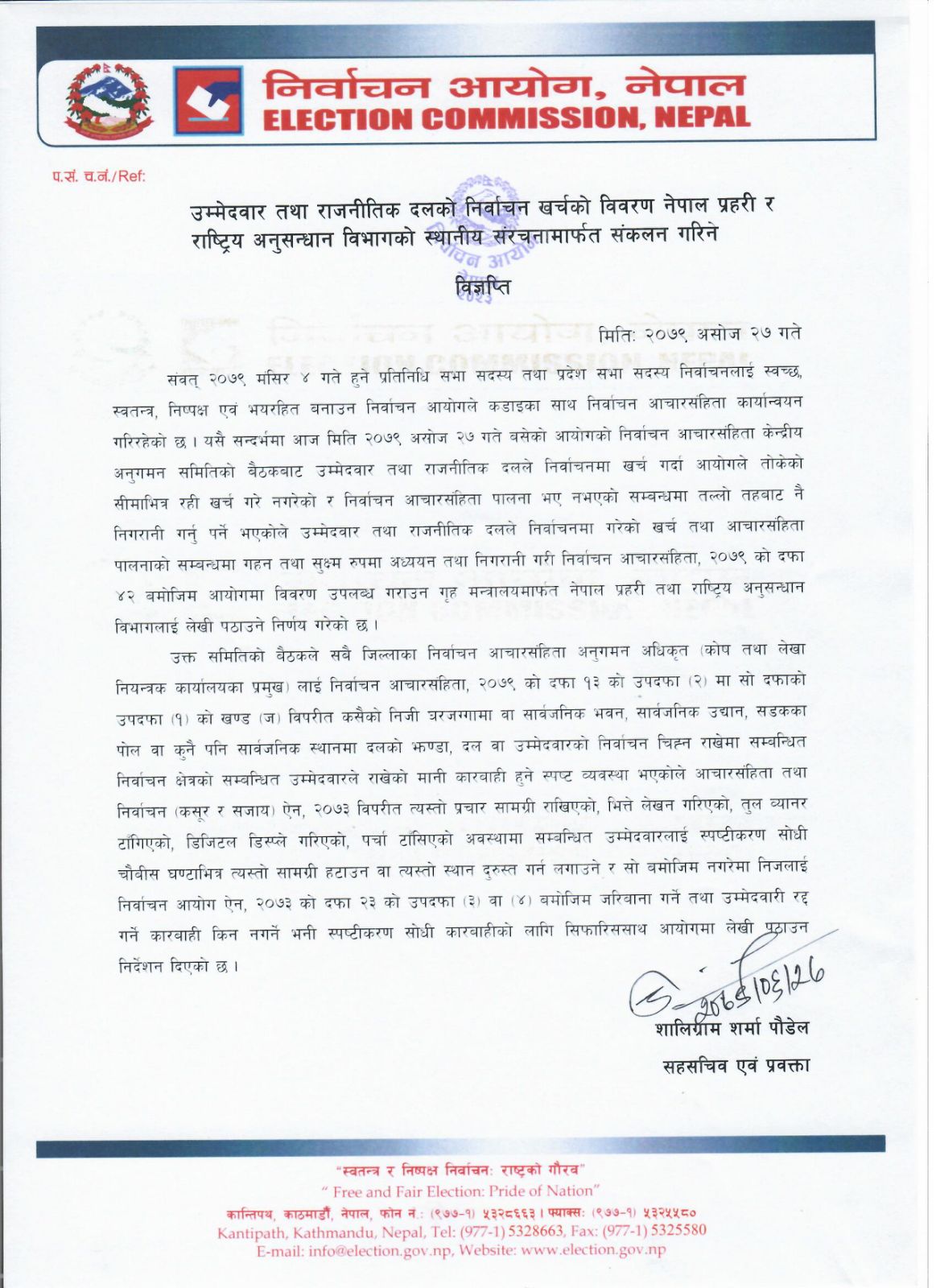 आयोगले खर्च सम्बन्धी विवरण तल्लो तहबाटै उपलब्ध गराउन गृह मन्त्रालयमार्फत प्रहरी र विभागलाई लेखी पठाउने निर्णय गरिएको प्रवक्ता शालिग्राम शर्मा पौडेलले जानकारी दिए ।